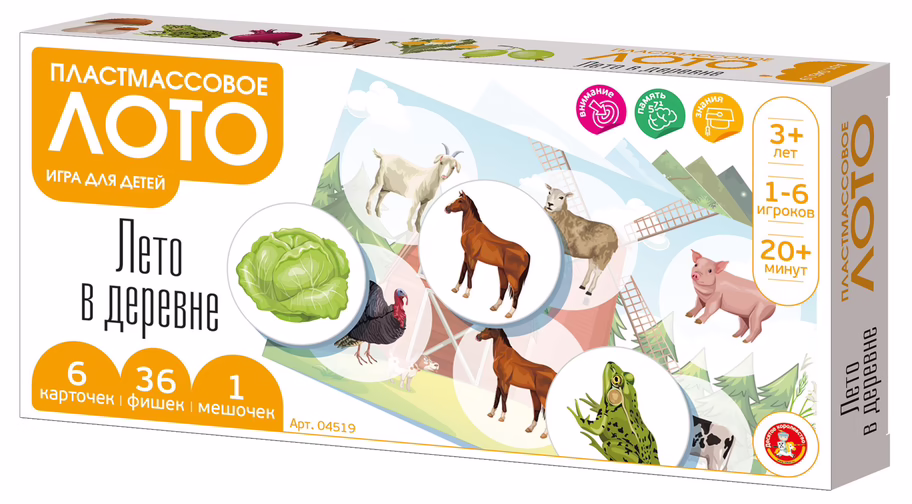 Лото пластмассовое "Лето в деревне" позволит в игровой форме познакомить ребенка с тем, что может окружать его вдали от города: фрукты, ягоды, полевые цветы, грибы, животные, обитатели рек, овощи с огорода.