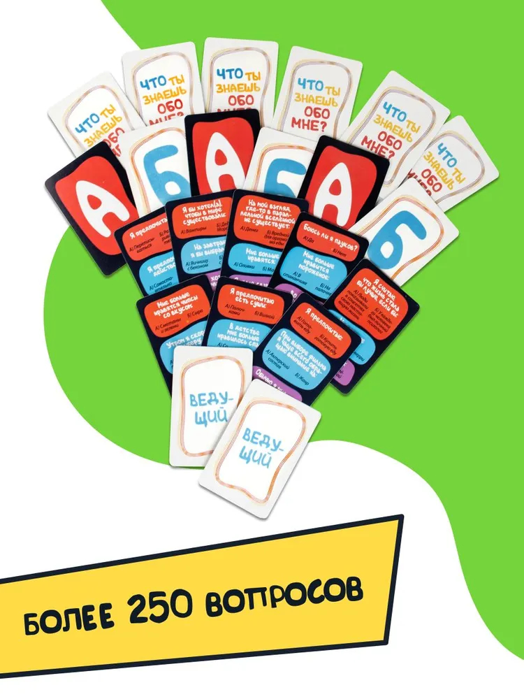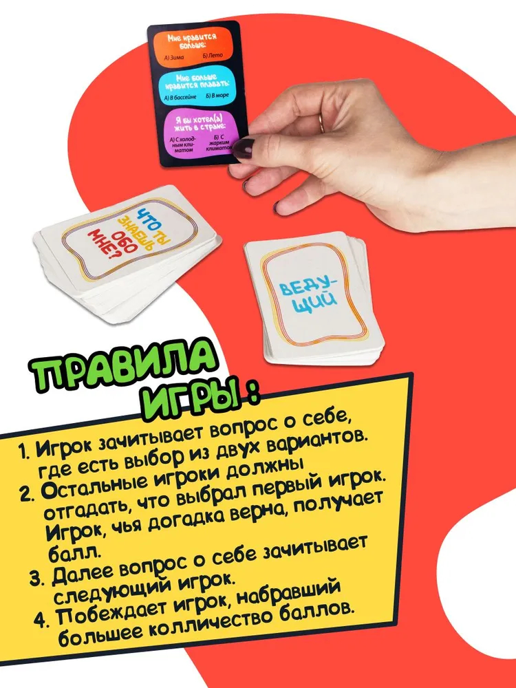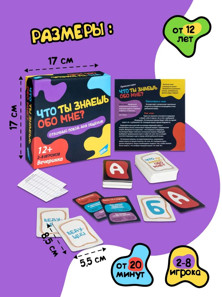 Увлекательная и динамичная настольная игра «Что ты знаешь обо мне?» доставит массу положительных эмоций. В процессе игры, участники узнают много новых фактов друг о друге, что сможет сплотить компанию играющих.
