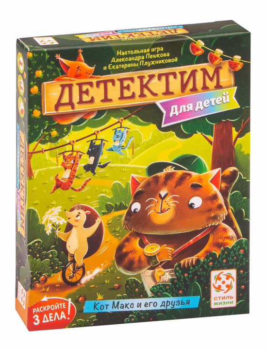 "Детектим. Для детей. Кот Макс и его друзья" – это кооперативная детективная игра для детей, в которой игрокам предстоит стать настоящими сыщиками. Перед юными детективами стоит задача узнать, что же произошло на самом деле в лесу, в котором живут наши животные.