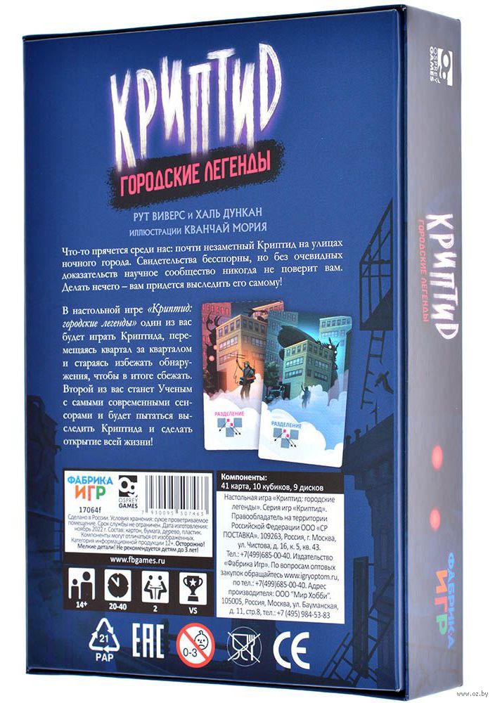 "Криптид. Городские легенды" – это динамичная карточная настольная игра. В отличие от оригинального "Криптида", что предназначен для более крупной компании, в "Городских легендах" сойдутся всего два игрока. Один из их возьмёт роль Учёного, а другой станет Криптидом!