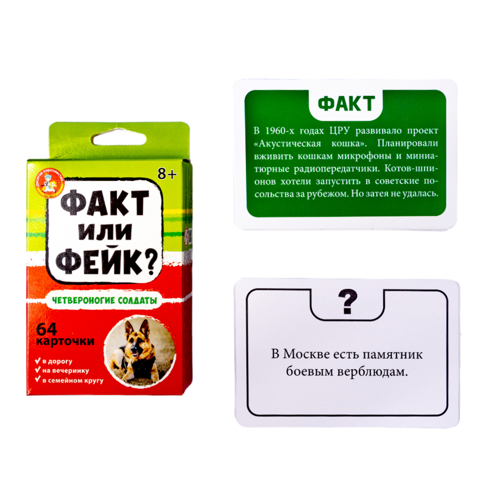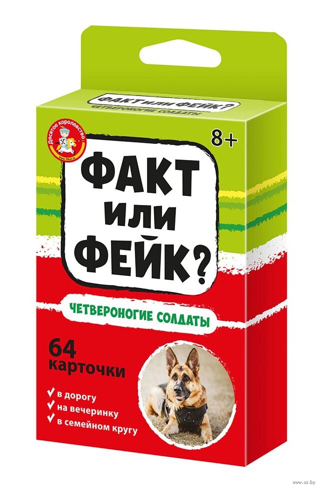 Детская настольная игра для большой компании "Факт или фейк. Четвероногие солдаты" – это интересная игра в удобном формате, которую можно взять с собой на вечеринку, в гости или в дорогу. С этой игрой вы проверите уровень своих знаний о служебных собаках и интересно проведете время в компании.