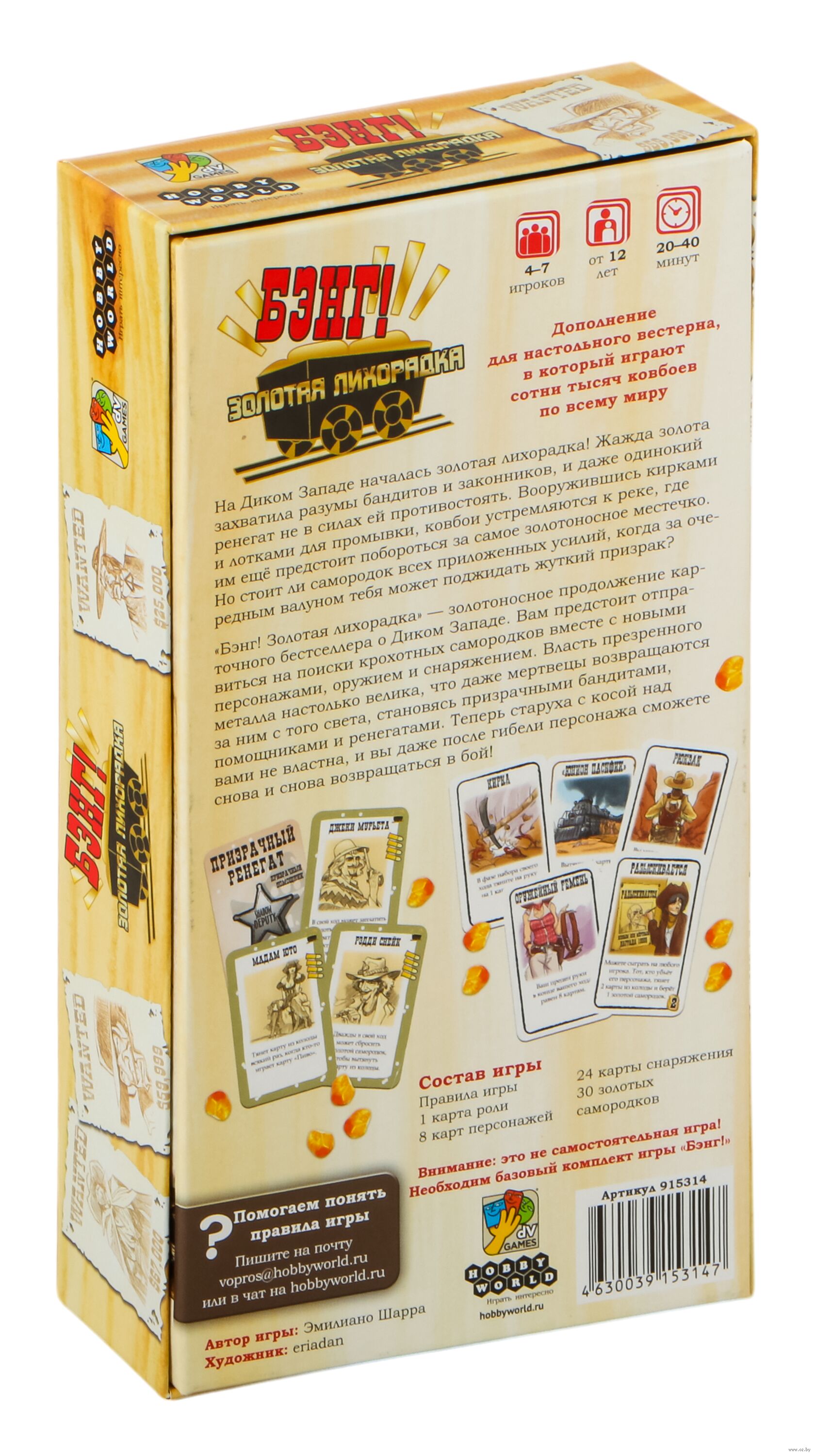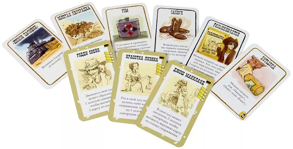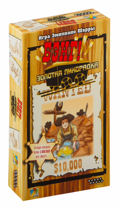 "Бэнг! Золотая лихорадка" – это золотое дополнение для игры "Бэнг", которое добавляет восемь играбельных персонажей, новые карты снаряжения и свежие механики.