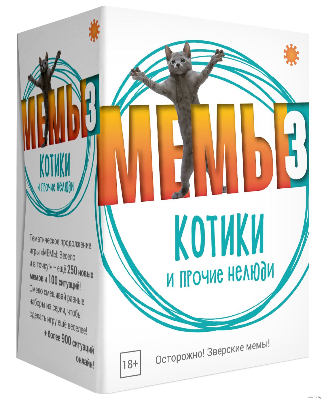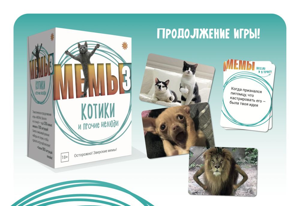 "Мемы 3. Котики и прочие нелюди" – это уже третья часть в серии вирусных игр от издательства "Экономикус". Правила остались такими же простыми: игроки зачитывают ситуацию, выкладывают к ней мемы и выбирают самый смешной вариант.