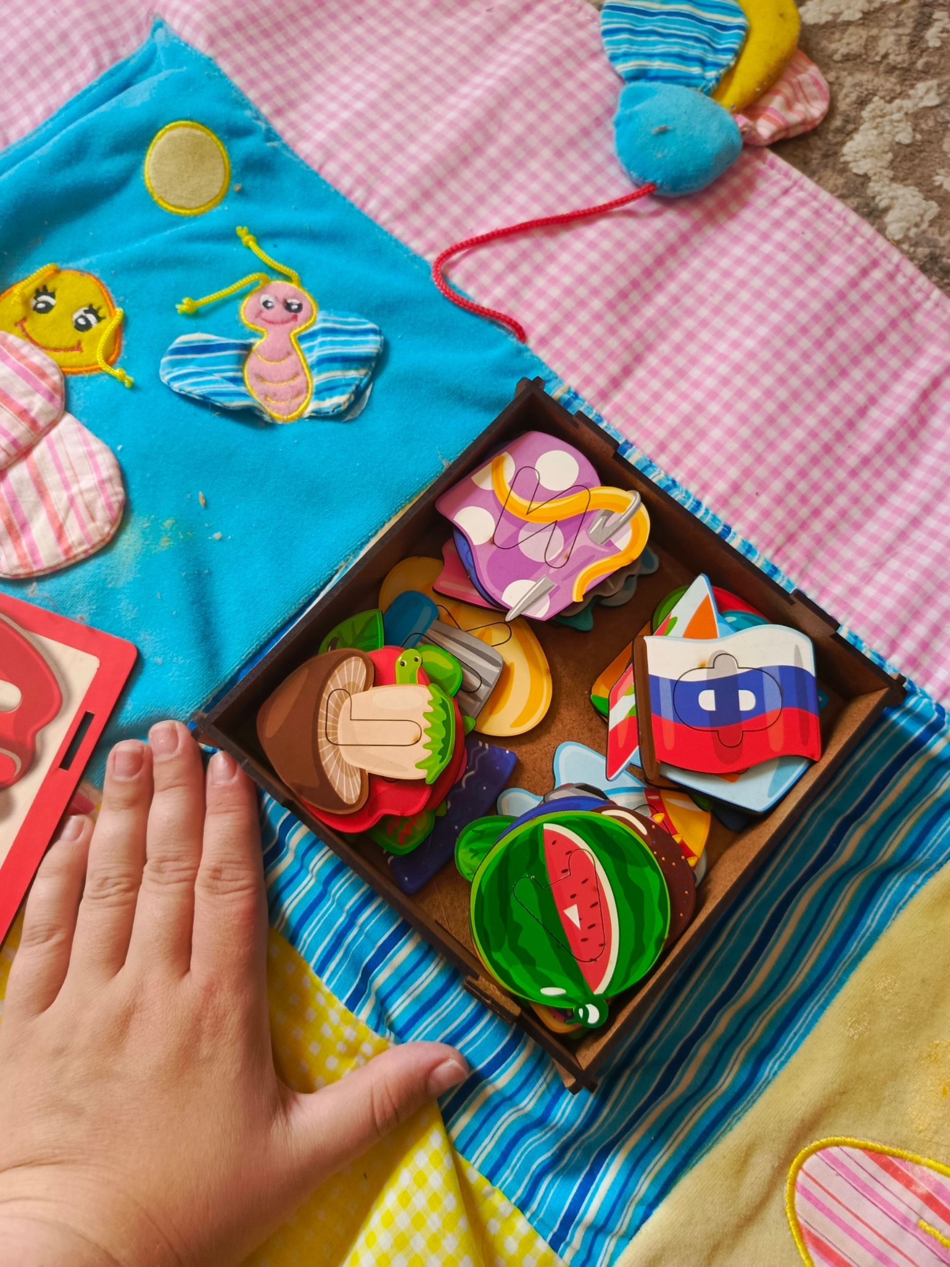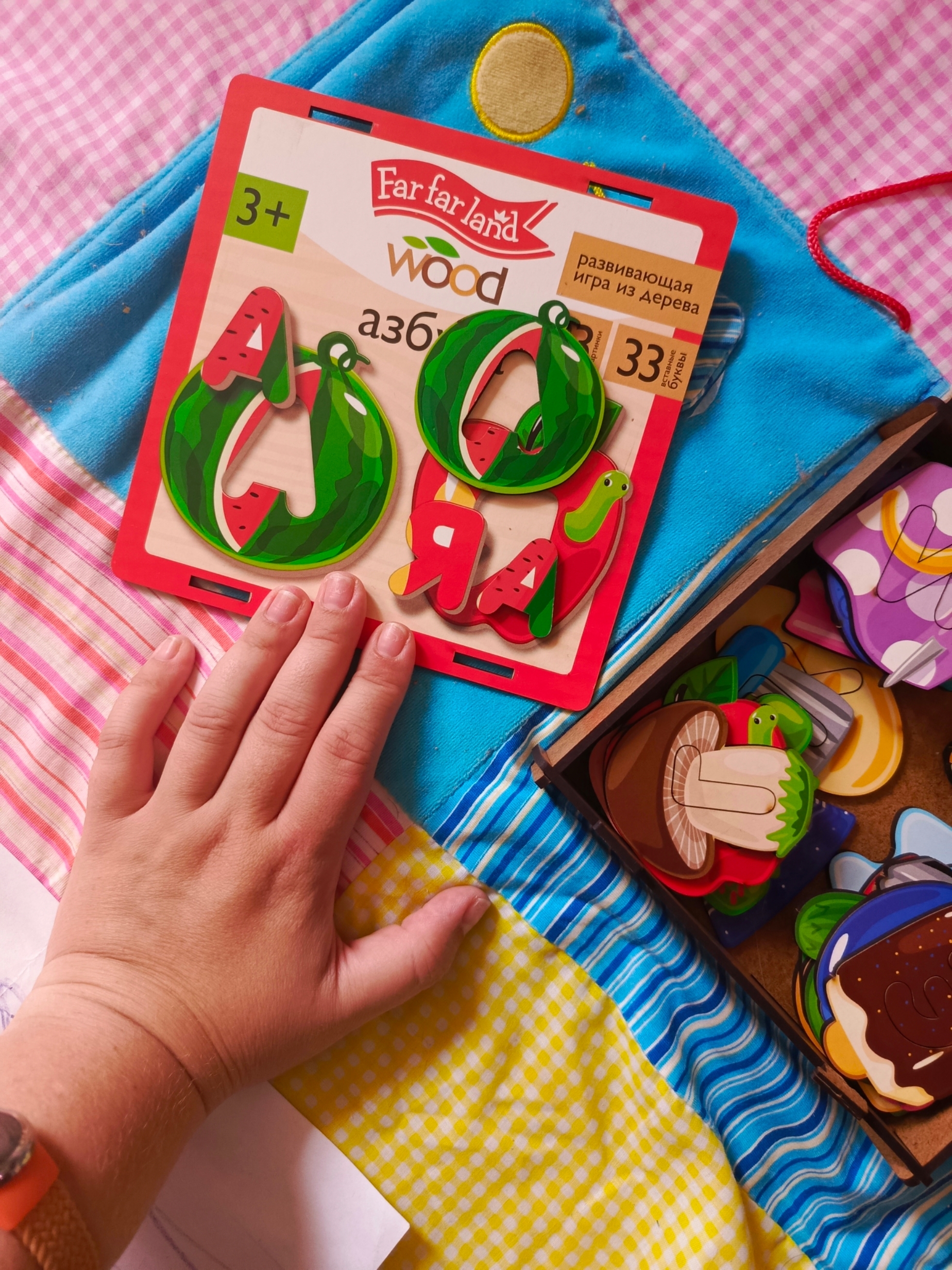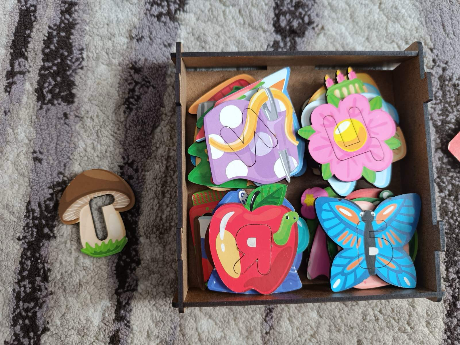 Хорошее качество игры, все плашки идеально отшлифованны, картинки яркие. Минусы: буквы маленькие, крышка коробки открывается слишком легко из-за этого ребенок может случайно потерять детали, при переносе коробки к месту игры