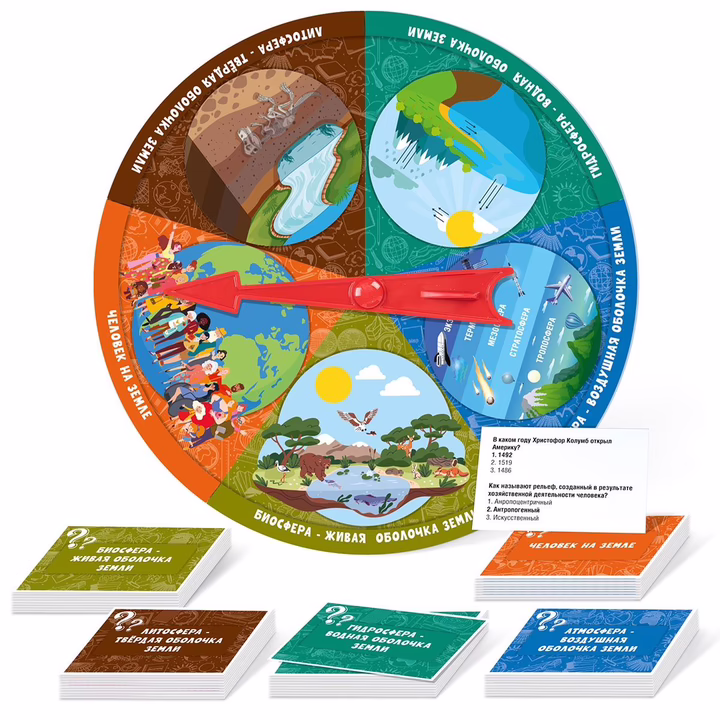 С настольной игрой-викториной "География" вы сможете проверить уровень знаний о биосфере, гидросфере, литосфере и атмосфере земли и узнать новые факты о деятельности человека на земле.