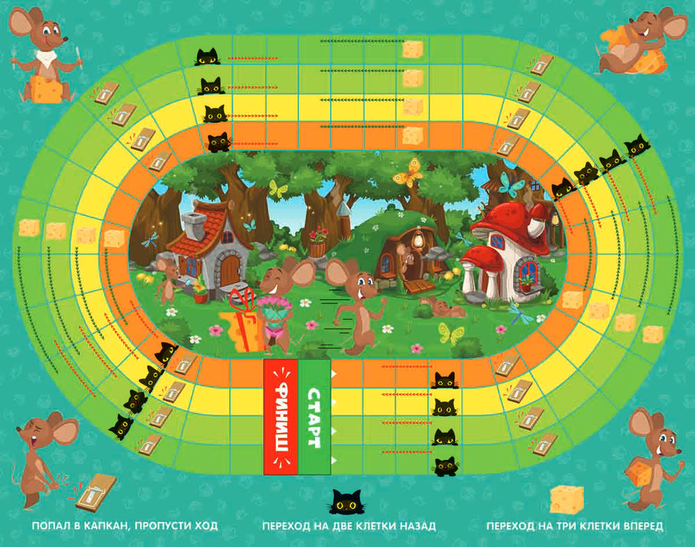 В него входит 4 настольных игры-ходилки: "Кошки-мышки", "Прогулка по зоопарку", "Гномы в доме" и "Монстрики" и 4 раскраски-иллюстрации к каждой игре.