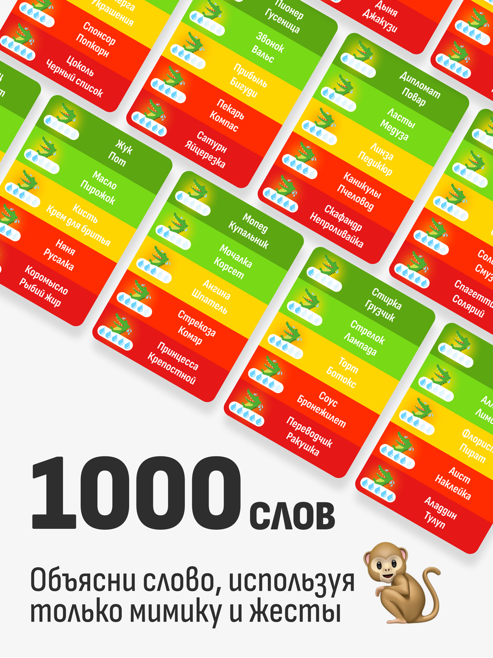 2 вида правил, 5 видов сложностей, 1000 слов. Необходимо объяснить слово, написанное на карточке, без слов, используя только мимику и жесты.