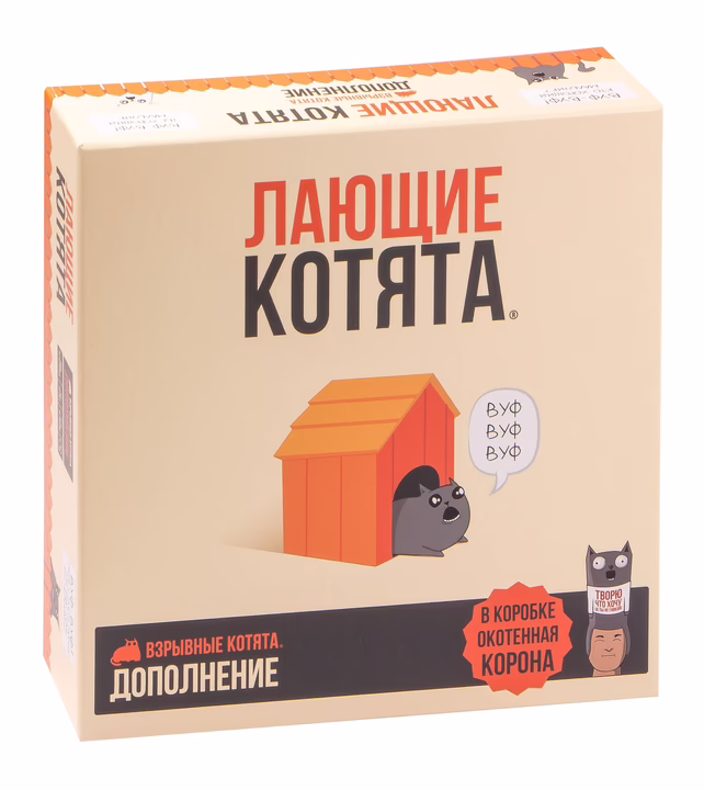 Перед вами "Лающие котята" – второе дополнение для "Взрывных котят", выпущенное на русском языке, которым вы можете разнообразить и версию 18+, и "Зомби-котят". Оно привносит в базовую игру ещё больше того, за что миллионы игроков по всему миру и полюбили котят – хаос, наполненный безудержным весельем! 20 карт с новыми свойствами удивят за столом всех и каждого, а за шикарную которокорону силы развернётся настоящая бойня!