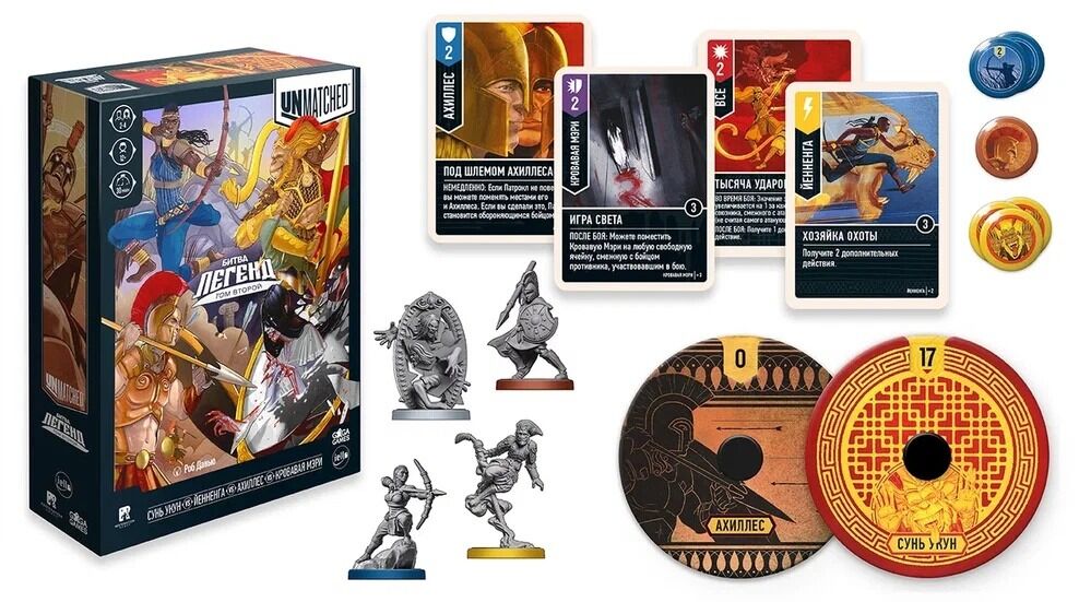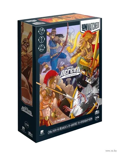 "Unmatched" – это быстрые партии, простые правила и по-настоящему азартные сражения, завёрнутые в потрясающе стильное оформление. Битва Легенд позволит вам сойтись в дуэльном противостоянии или сразиться в командном режиме втроём или вчетвером. А ещё вы можете смешать эту коробку с другими играми серии и сыграть за любимого персонажа против совершенно новых героев.