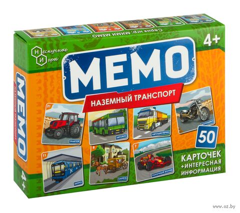 В наборе "Мемо. Наземный транспорт" игроки найдут самые разные средства передвижения: современные, такие как мотоцикл, и ушедшие в историю, как карета, хорошо знакомые, как автобус, и довольно редкие, например квадроцикл. Если с каким-то из видов транспорта участники плохо знакомы, не беда! Ведь в комплект входит брошюра с интересными фактами об объектах на карточках.