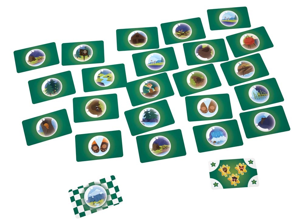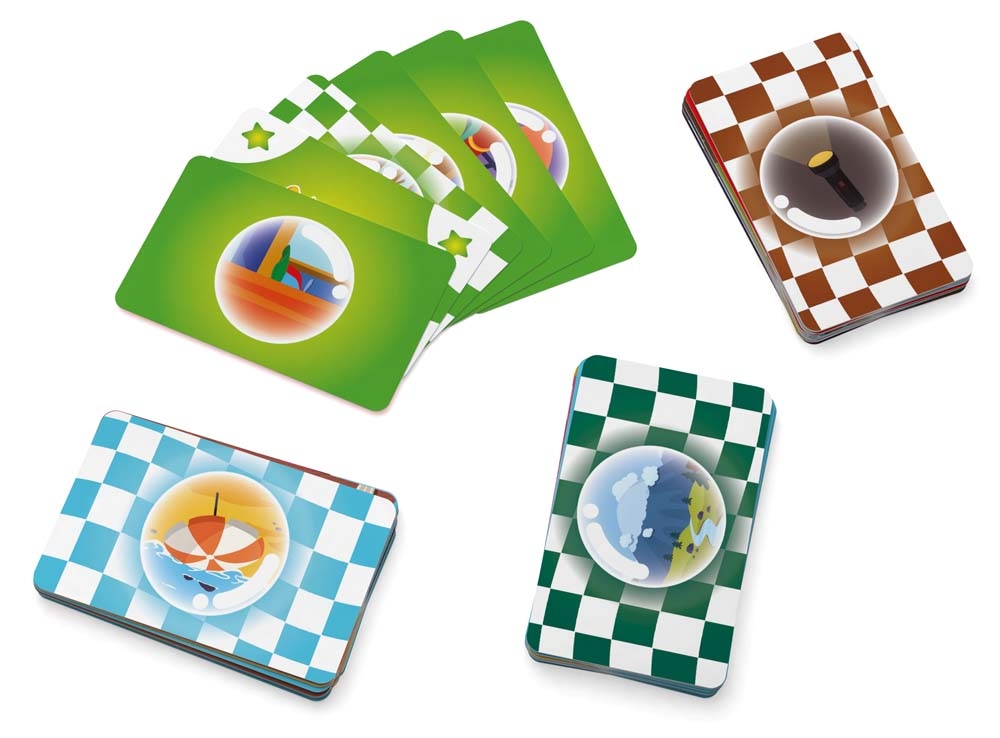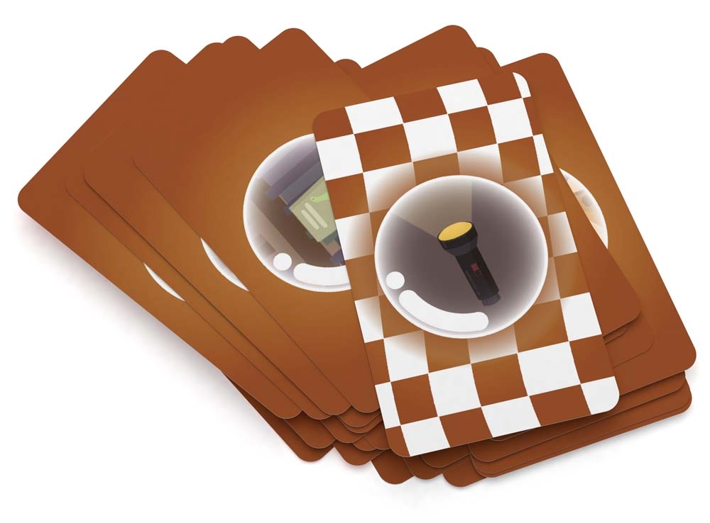 83 карточки с приключениями разделённые на 4 стопки: 6 зелёных карточек и инструкция, 24 коричневые карточки, 28 голубых карточек, 25 тёмно-зелёных карточек