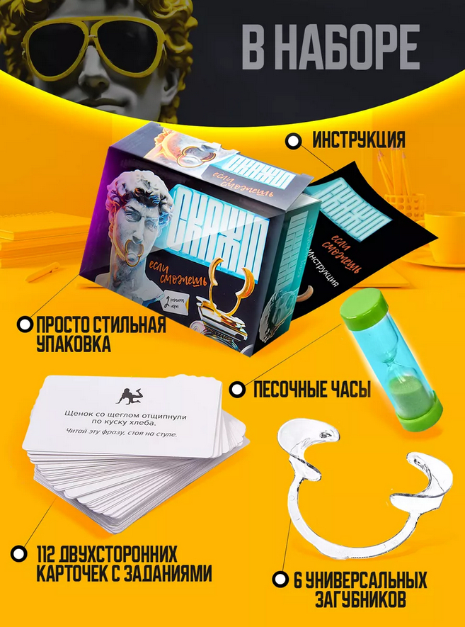 Цель игры: набрать как можно больше карточек, правильно выговаривая фразы в загубниках.