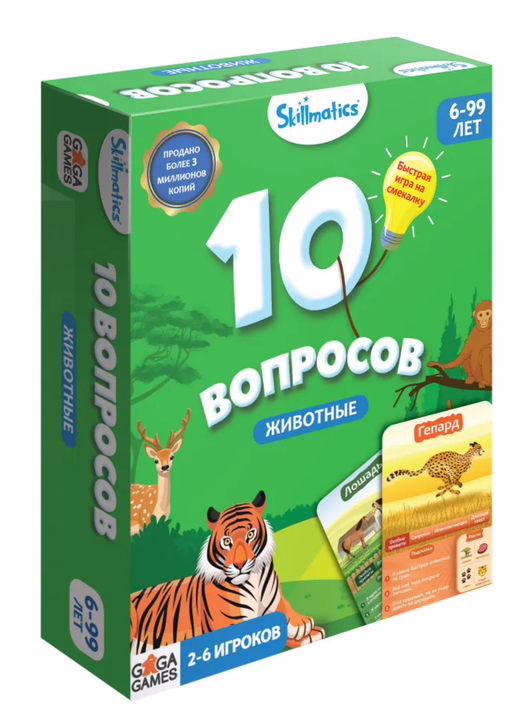 Задача игроков – по очереди отгадывать животных на карточке соперника с помощью десяти наводящих вопросов. Например, вам известно, что это рептилия с длинным хвостом. Что ещё будет полезно узнать? Может быть, чем питается животное, где живёт, какого оно цвета или вовсе, сколько букв в его названии? Задавайте любые вопросы, на которые соперник может ответить только «да» или «нет», но помните – их количество ограничено. Побеждает тот, кто первым отгадает семь животных.