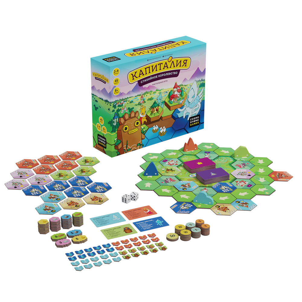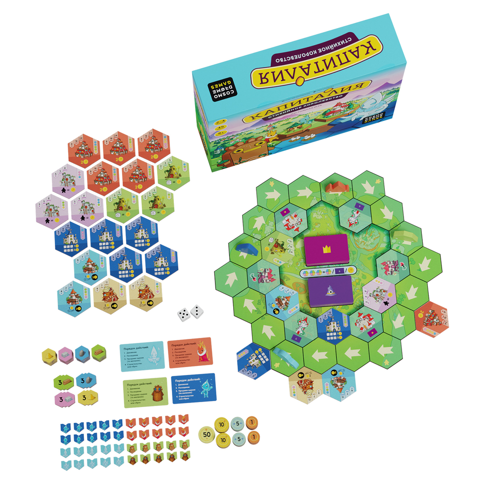 Главная цель в этой игре – быстрее остальных игроков заработать 100 млн. Для этого вы будете строить здания, собирать с них прибыль, участвовать в событиях и путешествовать по землям Капиталии. Бросайте кубики, и вперёд, к победе.
