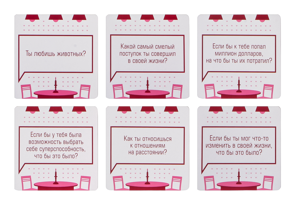По очереди вытягивайте карты из колоды и зачитывайте вопрос. Далее по очереди на него отвечайте. Никаких очков, соревнований и определения победителей. Просто карты для развития диалога и сближения.