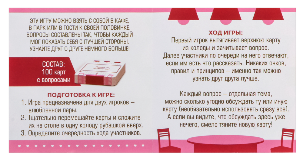 Это романтическая игра для двоих, которую можно взять с собой в кафе, парк или в гости к своей второй половинке. Узнайте друг о друге немного больше с помощью 100 вопросов на самые разные темы.