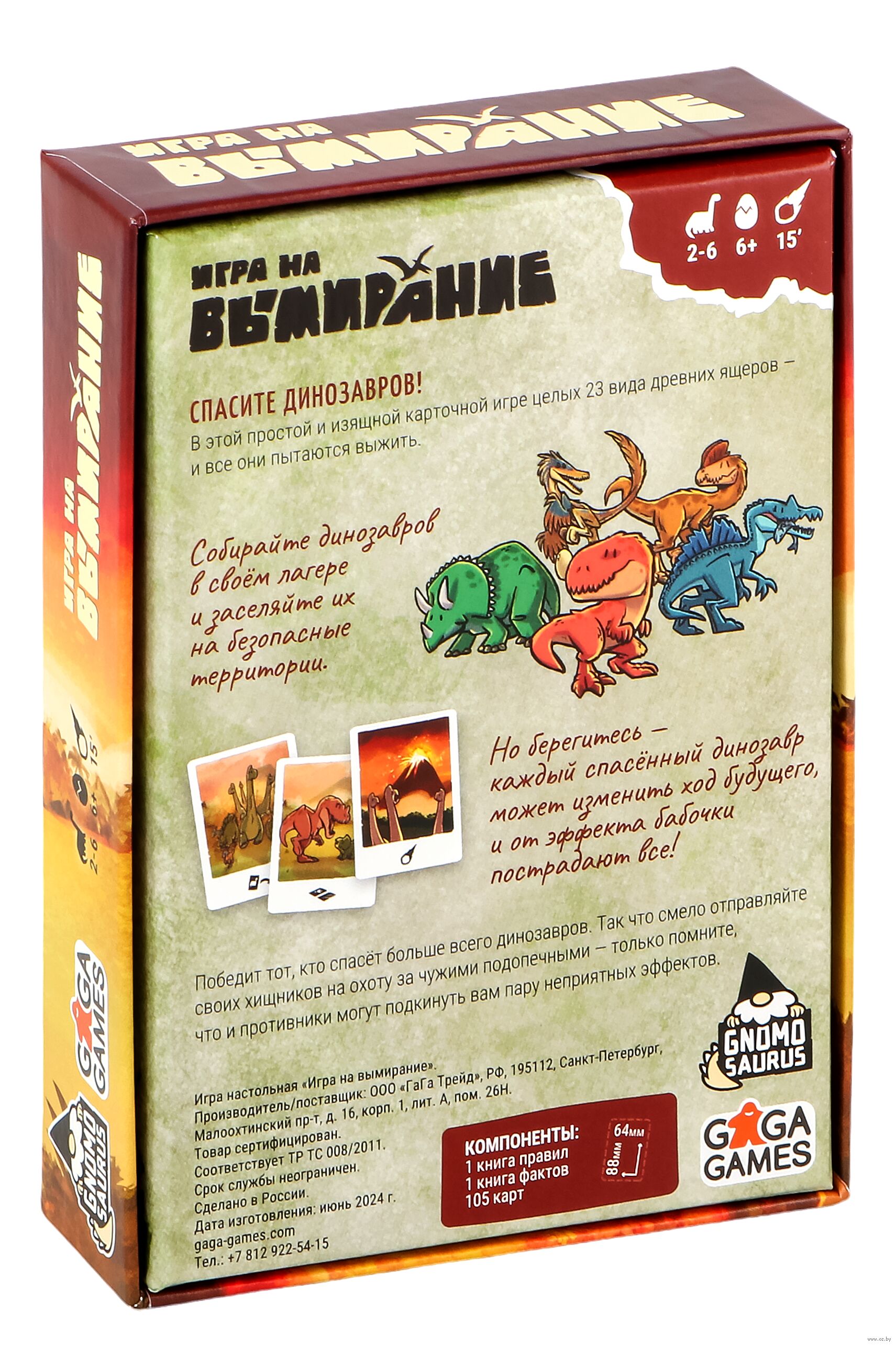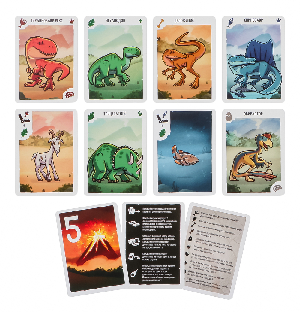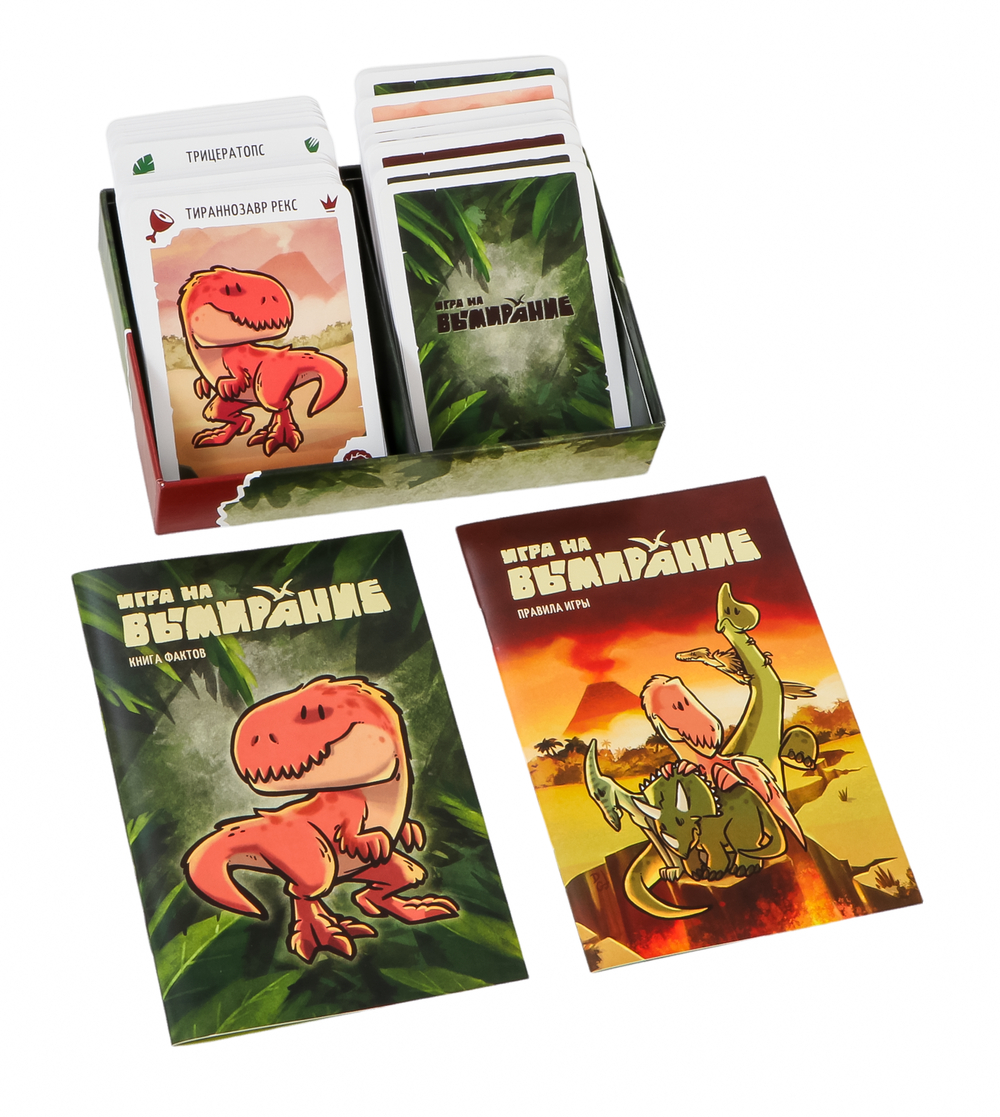 "Игра на вымирание" – это быстрая игра с милыми динозаврами на картах, в которой вы будете кормить обитателей своего лагеря, ловить ящеров на живца, уводить их из-под носа соперников и, конечно же, спасать от вымирания.