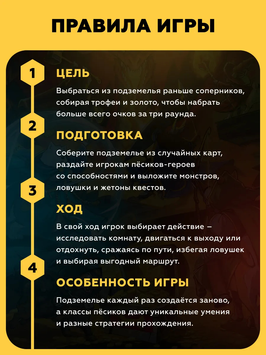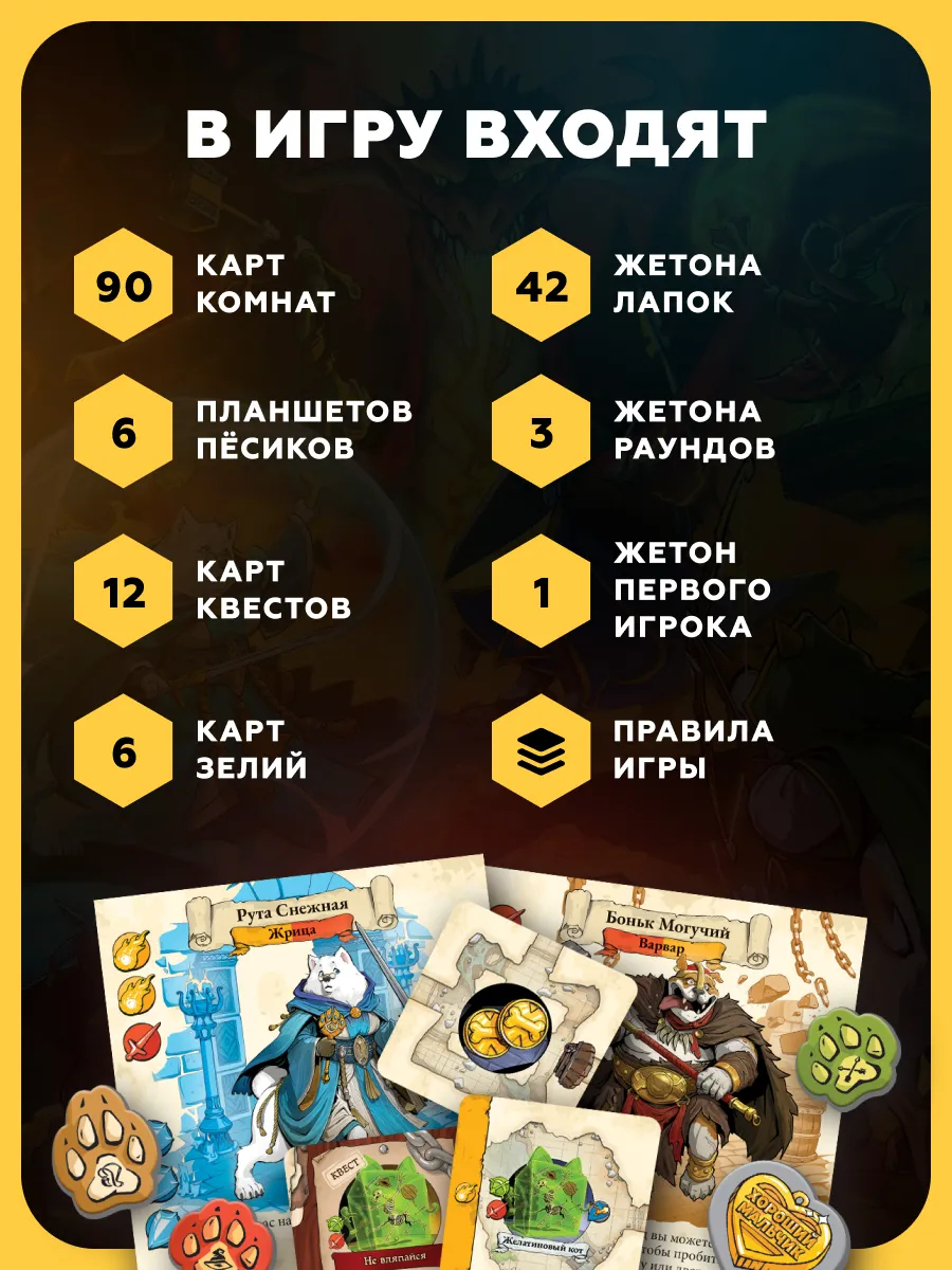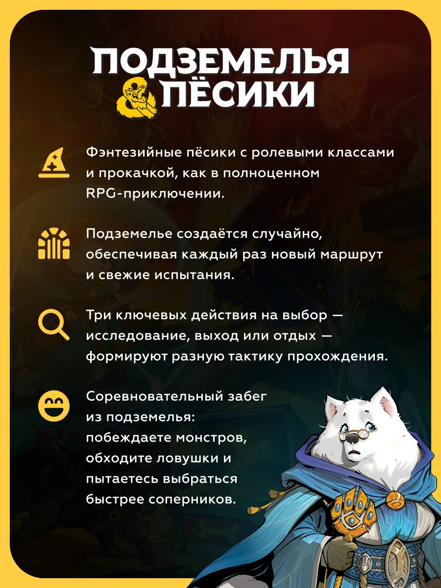 Добро пожаловать на волшебные соревнования по побегу из подземелья! Самые смелые пёсики спустятся в глубокие мрачные комнаты, чтобы сразиться с монстрами и собрать трофеи. Победителей ждут слава, титулы и вкусные косточки!