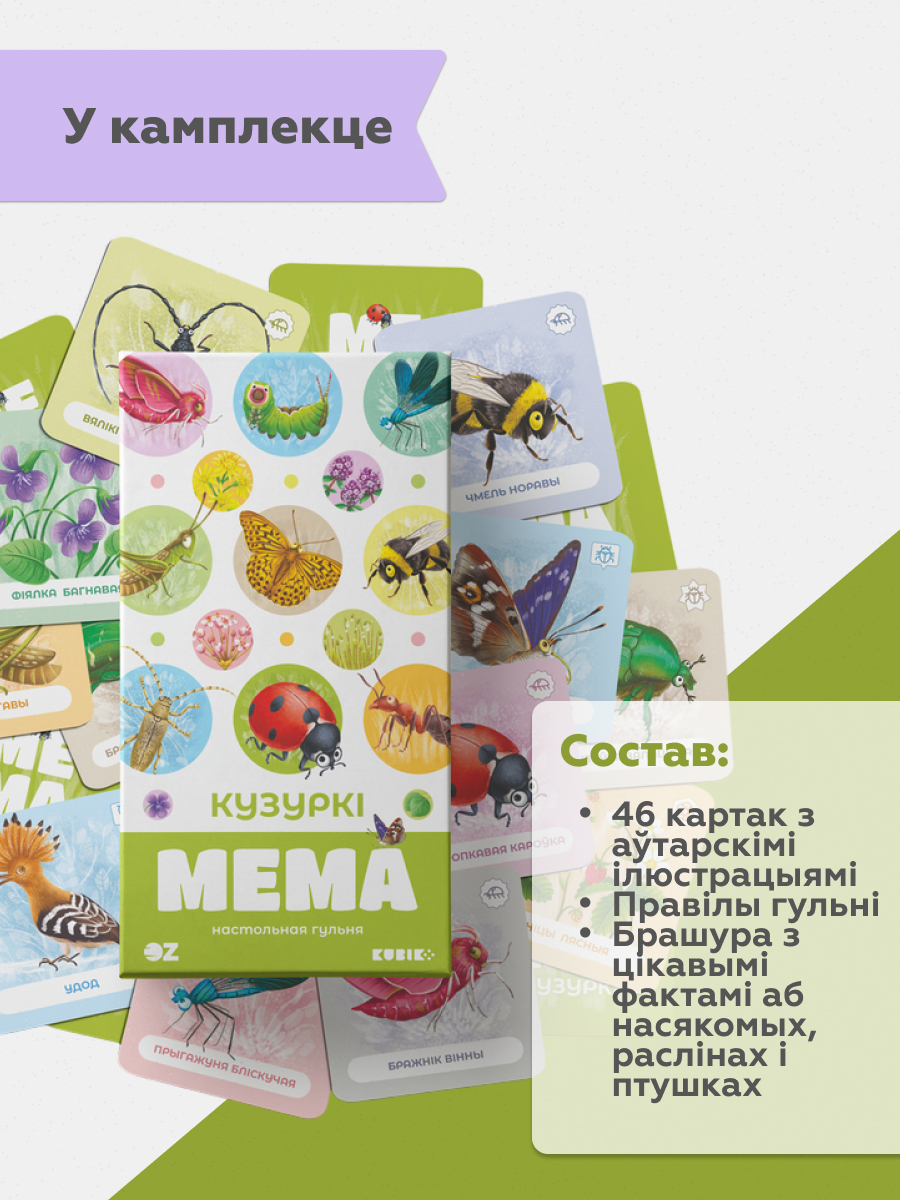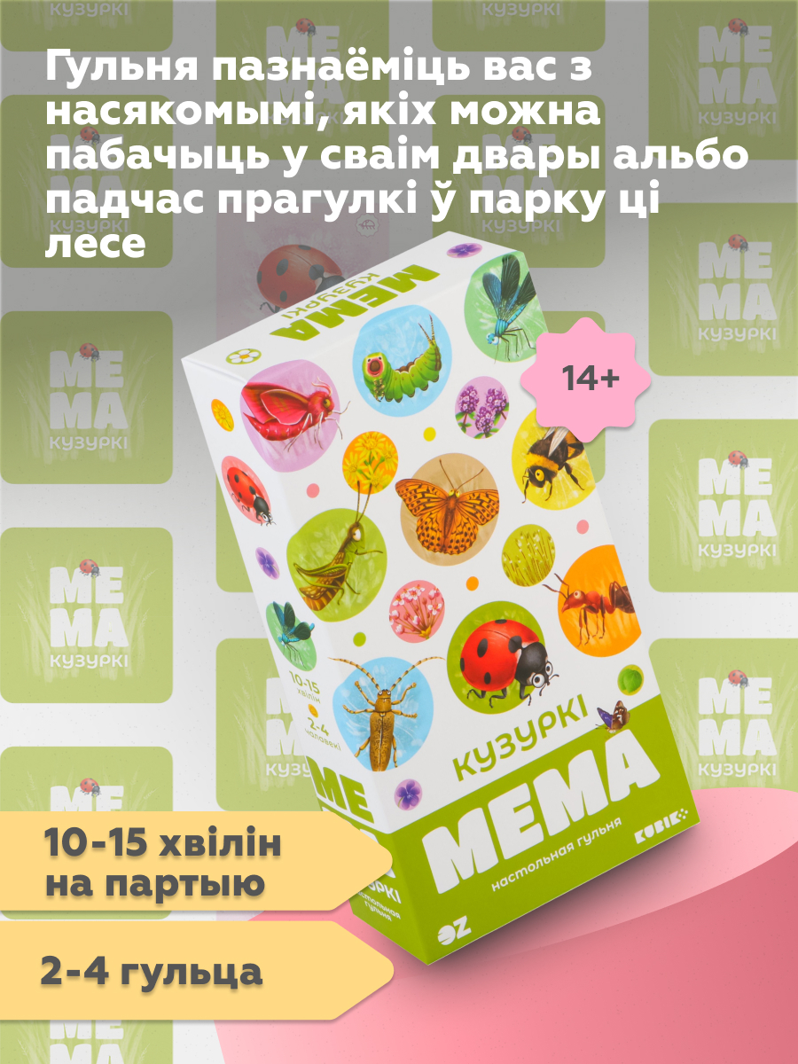 Настольная гульня "МЕМА. Кузуркі" пазнаёміць вас з насякомымі, якіх можна пабачыць у сваім двары альбо падчас прагулкі ў парку ці лесе.
