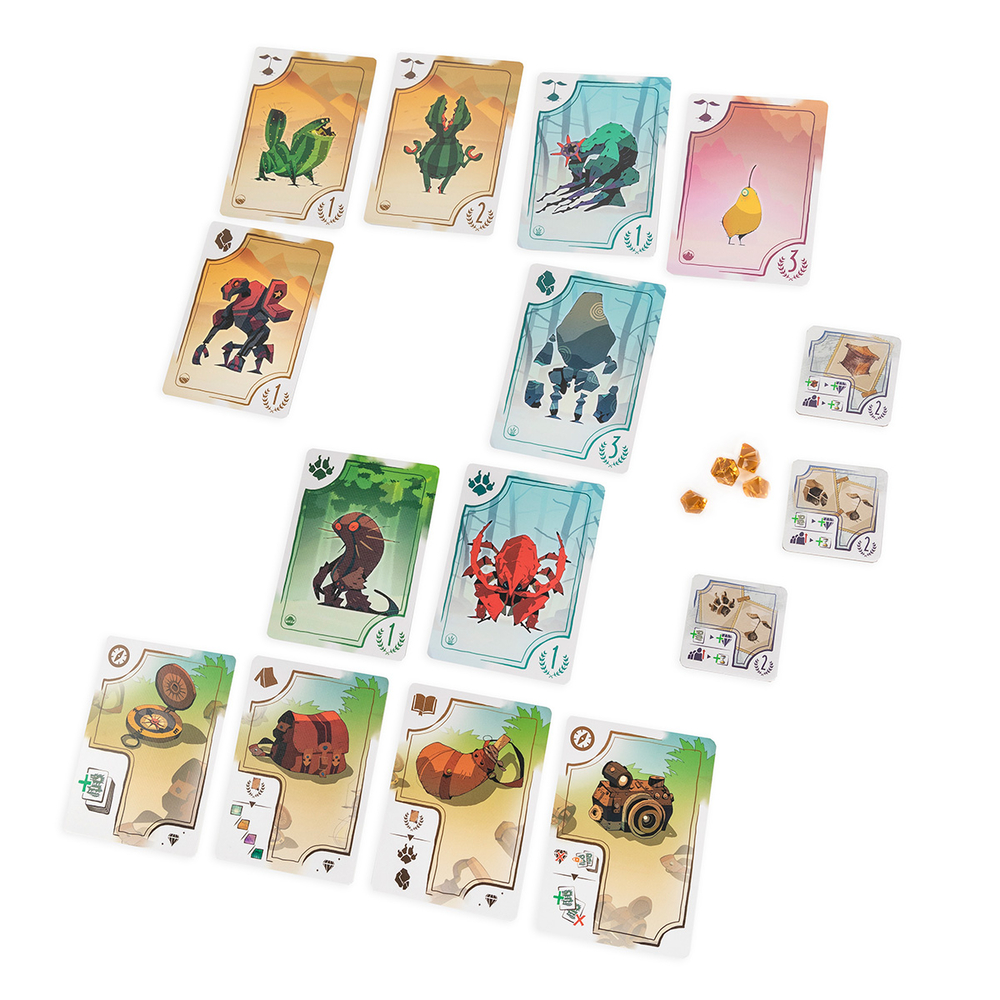 Каждое фантастическое существо обитает в своей среде, поэтому они выложены на стол сеткой карт в разные столбцы и ряды. Чтобы заполучить зверя, вы будете должны разыграть комбинацию из домино, значения которых определят, из какого столбца и ряда вам достанется карта. Грамотно комбинируйте значения, чтобы заполучить самые красивые экземпляры фантастической фауны и заработать как можно больше победных очков!