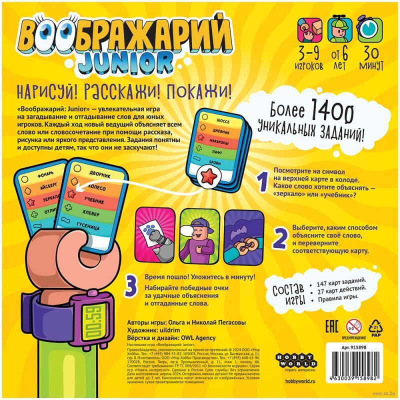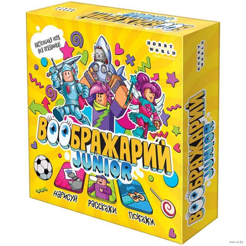 "Воображарий. Junior" – увлекательная игра на загадывание и отгадывание слов для юных игроков. Каждый ход новый ведущий объясняет всем слово или словосочетание при помощи рассказа, рисунка или яркого представления. Задания понятны и доступны детям, так что они не заскучают!