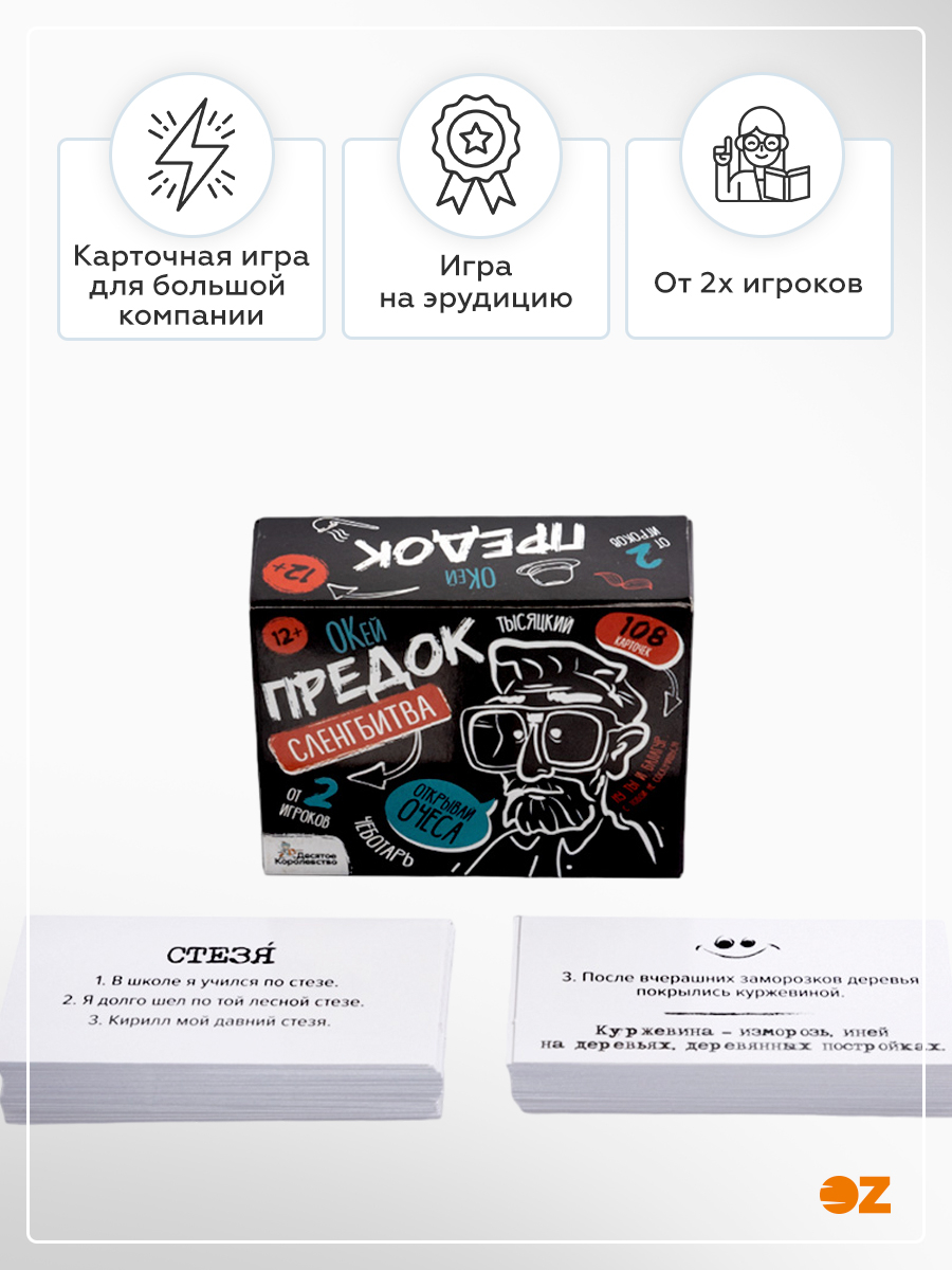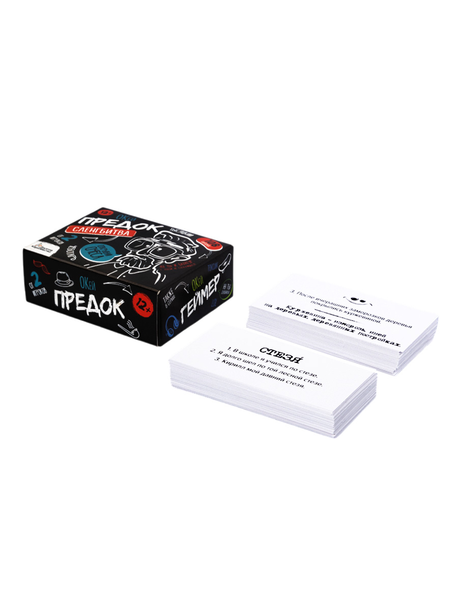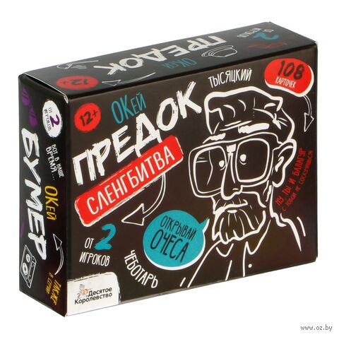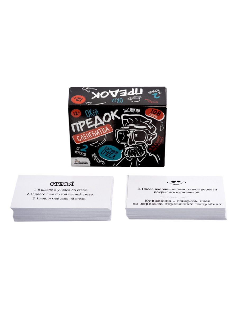 С настольной игрой для большой компании «Сленгбитва. Окей Предок» вы проверите уровень знания старых слов и выражений. Игроки узнают, кто такой шпынь и балагур? Что такое шаньга и хмара? Победит тот, кто даст больше правильных ответов!