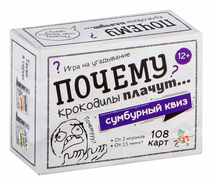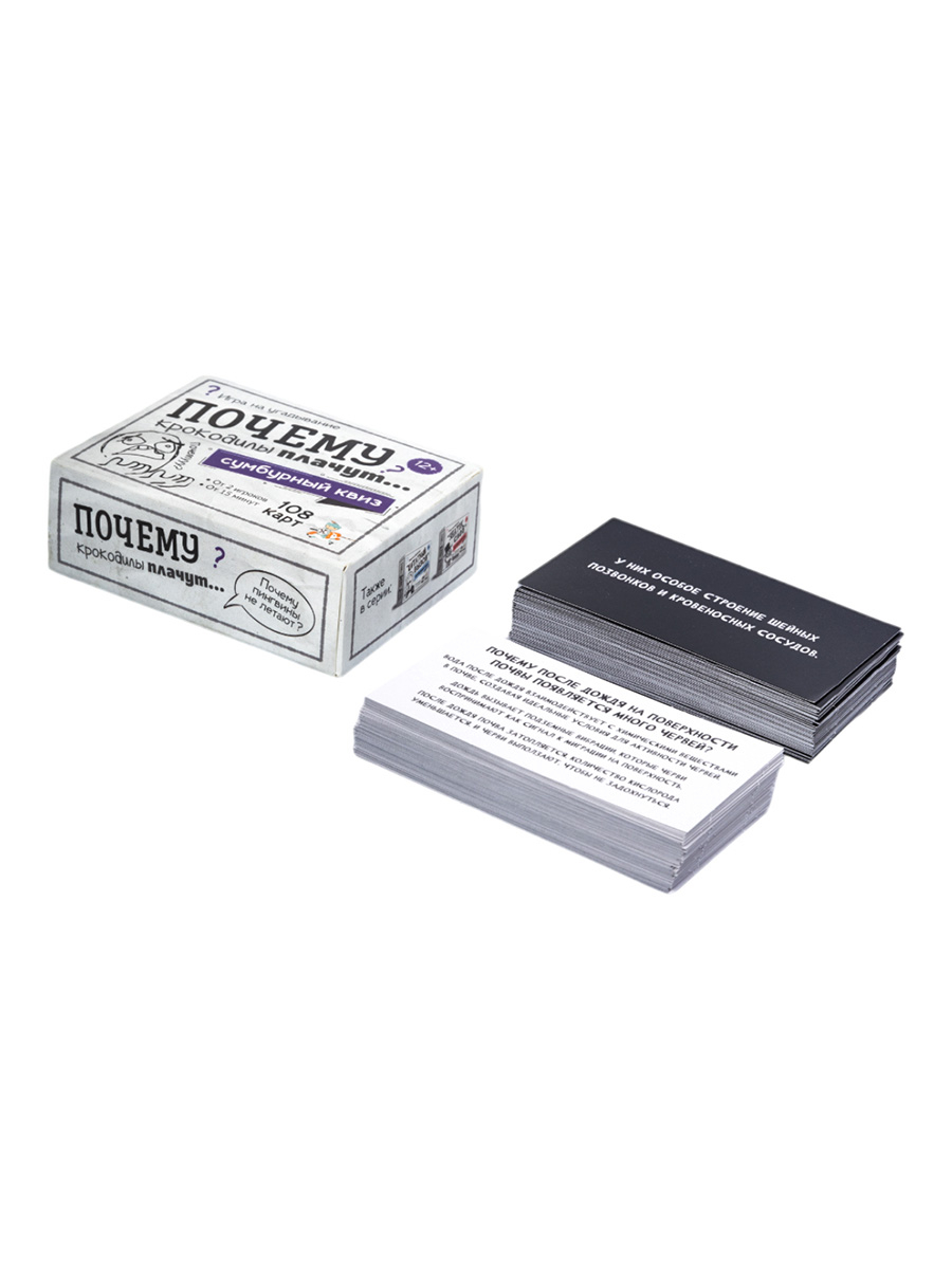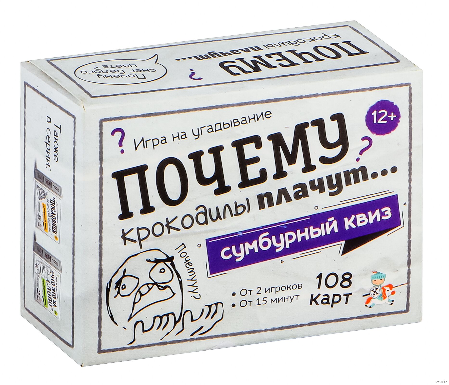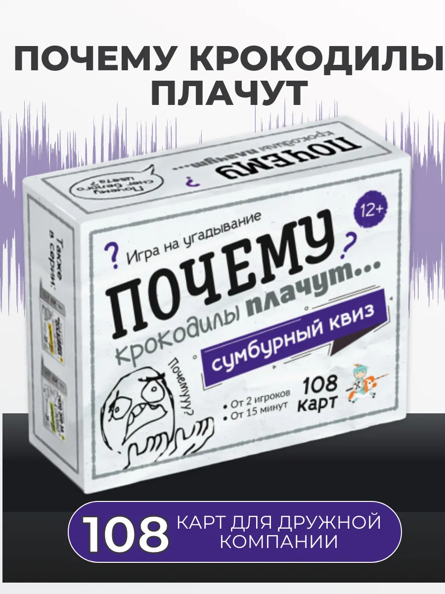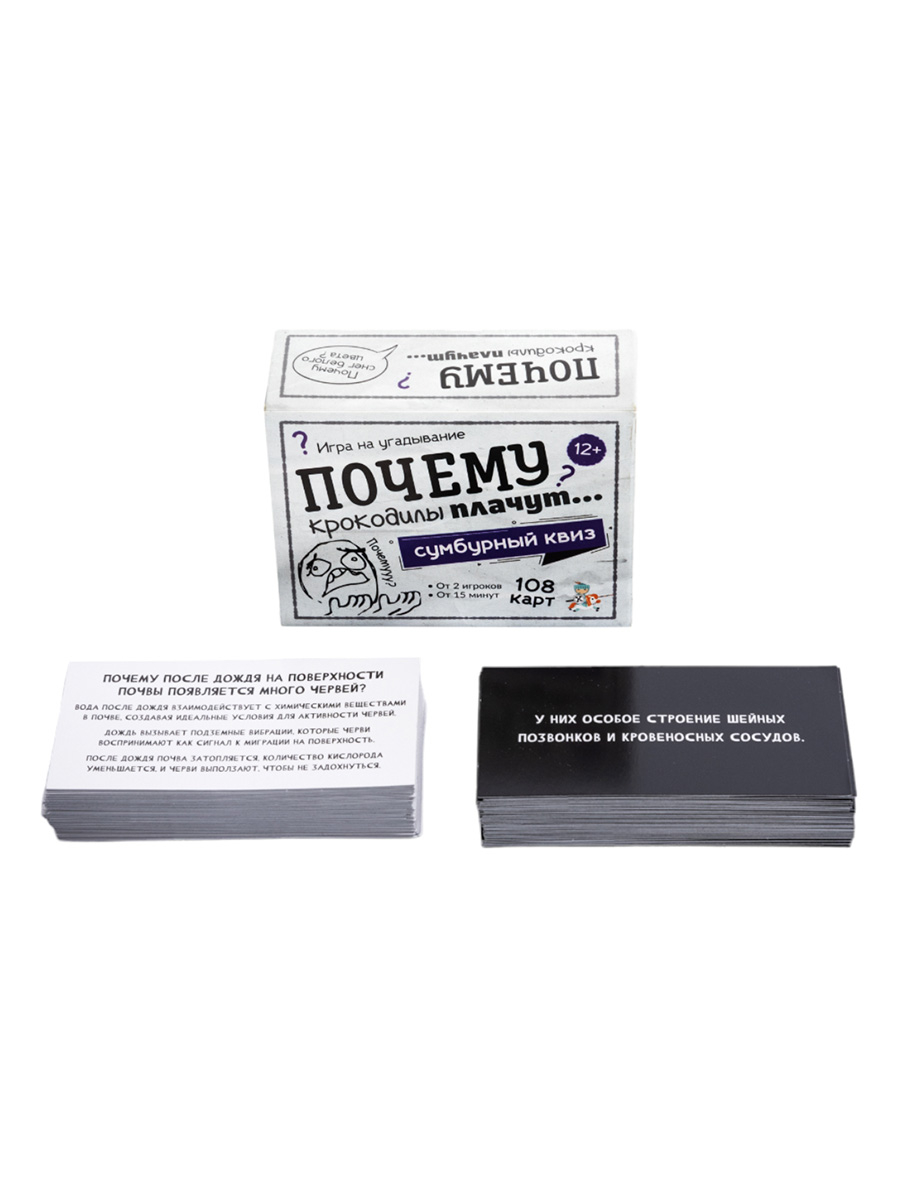 Настольная игра для большой компании "Сумбурный квиз. Почему крокодилы плачут" – это интеллектуально-развлекательная игра, в которой игроки проверяют эрудицию, отвечая на вопросы из разных областей знаний.
