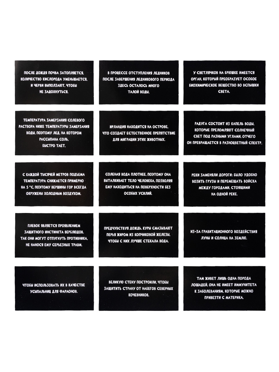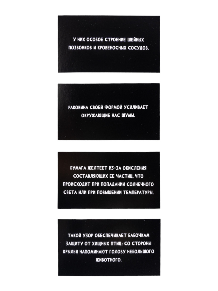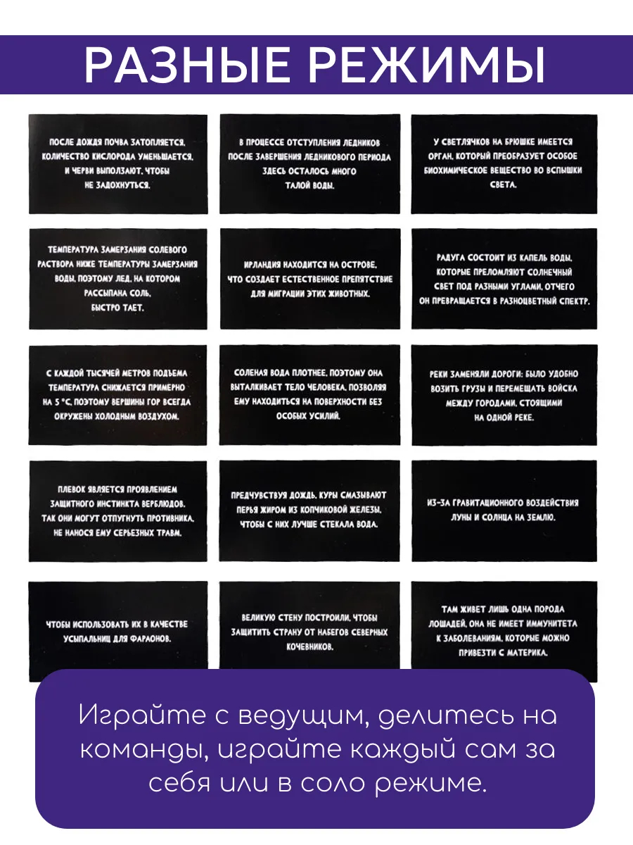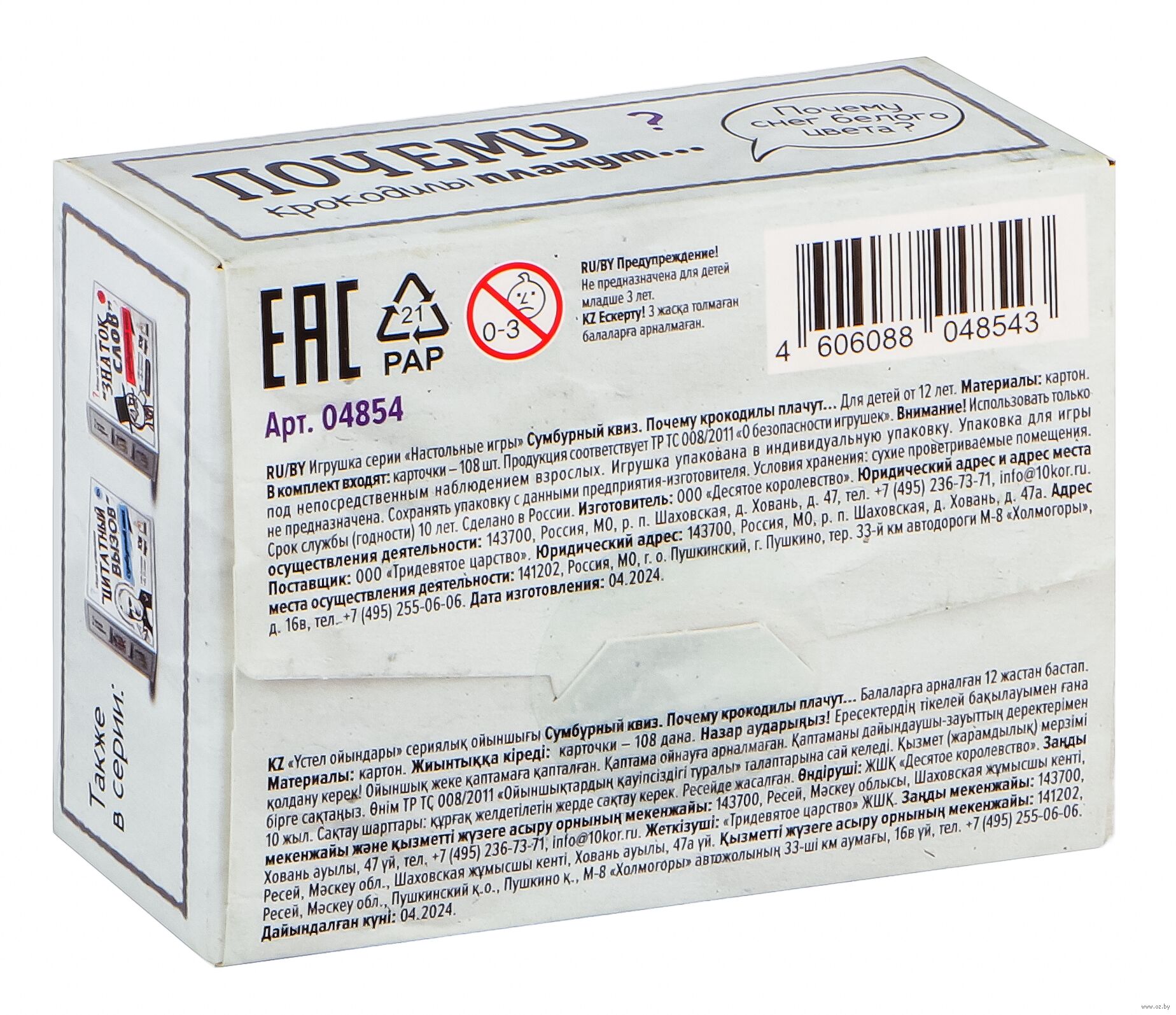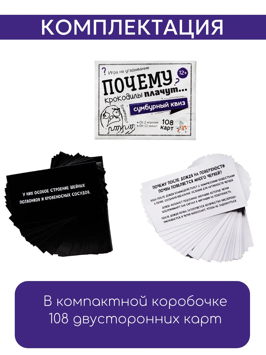Настольная игра для большой компании "Сумбурный квиз. Почему крокодилы плачут" – это интеллектуально-развлекательная игра, в которой игроки проверяют эрудицию, отвечая на вопросы из разных областей знаний.