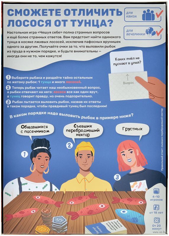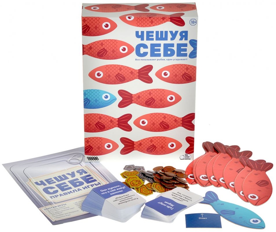 Настольная игра "Чешуя себе" полна странных вопросов и ещё более странных ответов. Вам предстоит найти одинокого тунца в косяке лживых лососей, исключив пафосных врунишек одного за другим. Получайте очки за то, что выловили рыбок из пруда в нужном порядке, и будьте внимательны – иногда они не то, чем кажутся!