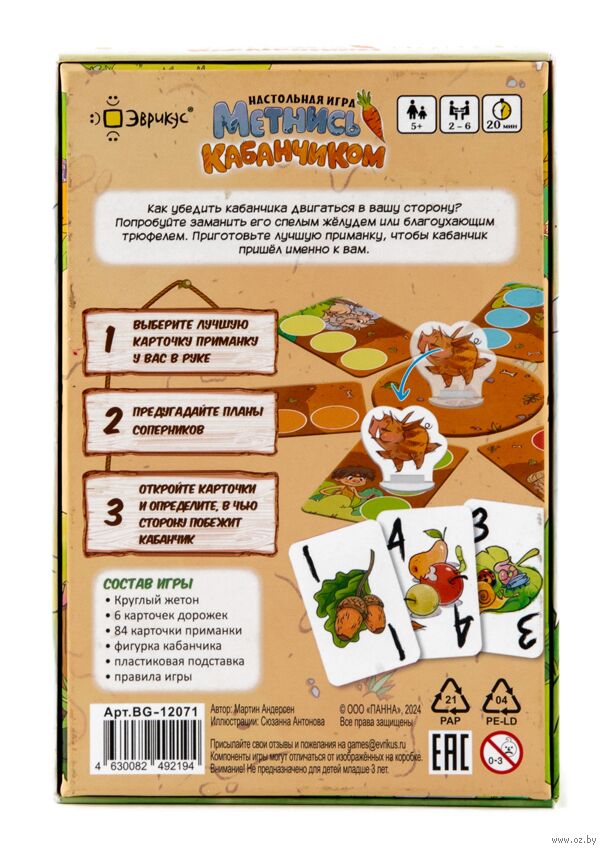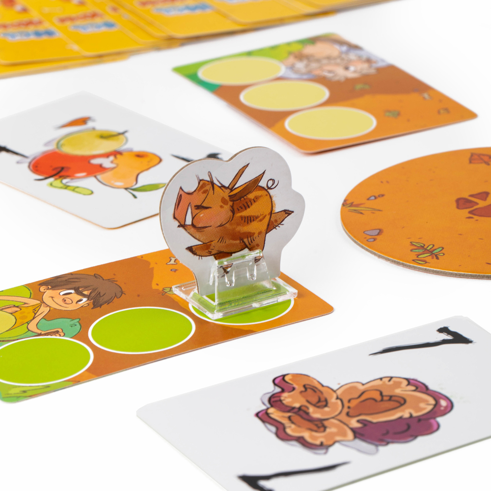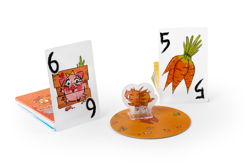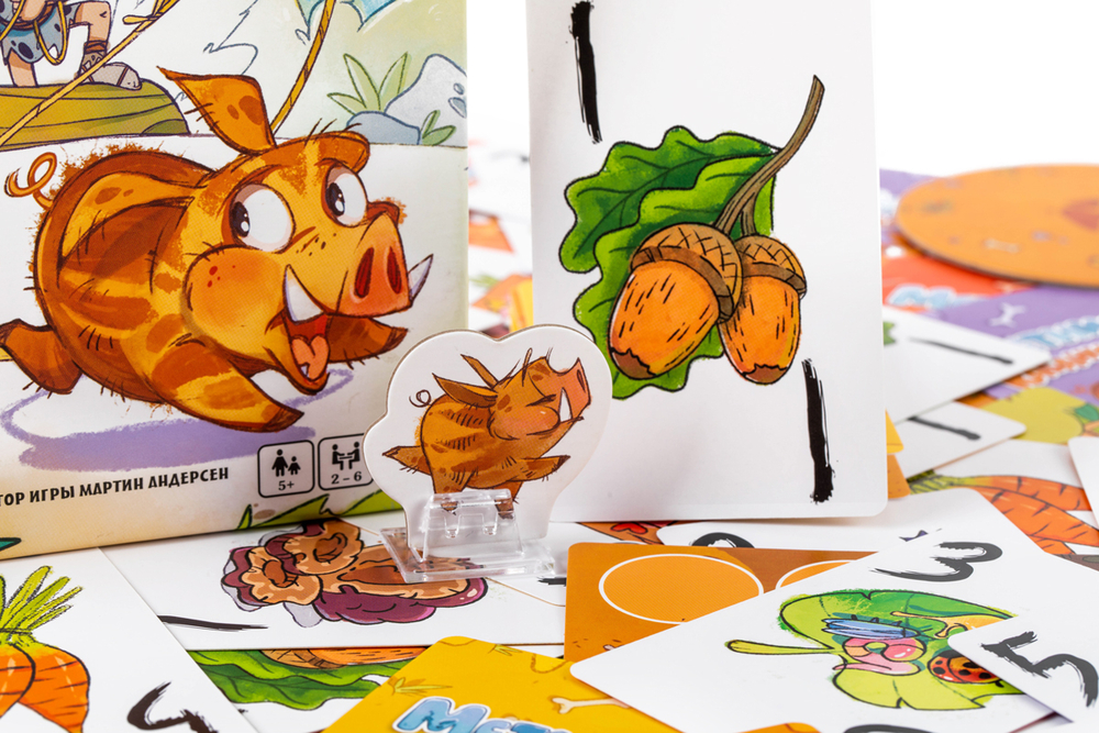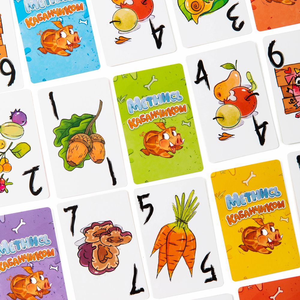 "Метнись кабанчиком" – это азартная семейная игра, в которой вам предстоит играть карточки с разными приманками, чтобы кабанчик пошёл именно к вам. Спелый жёлудь, благоухающий трюфель, сочная морковь, а может быть портрет милой кабанихи – что приглянется пока еще дикому зверю? Выбирайте с умом и приручите кабанчика первым!