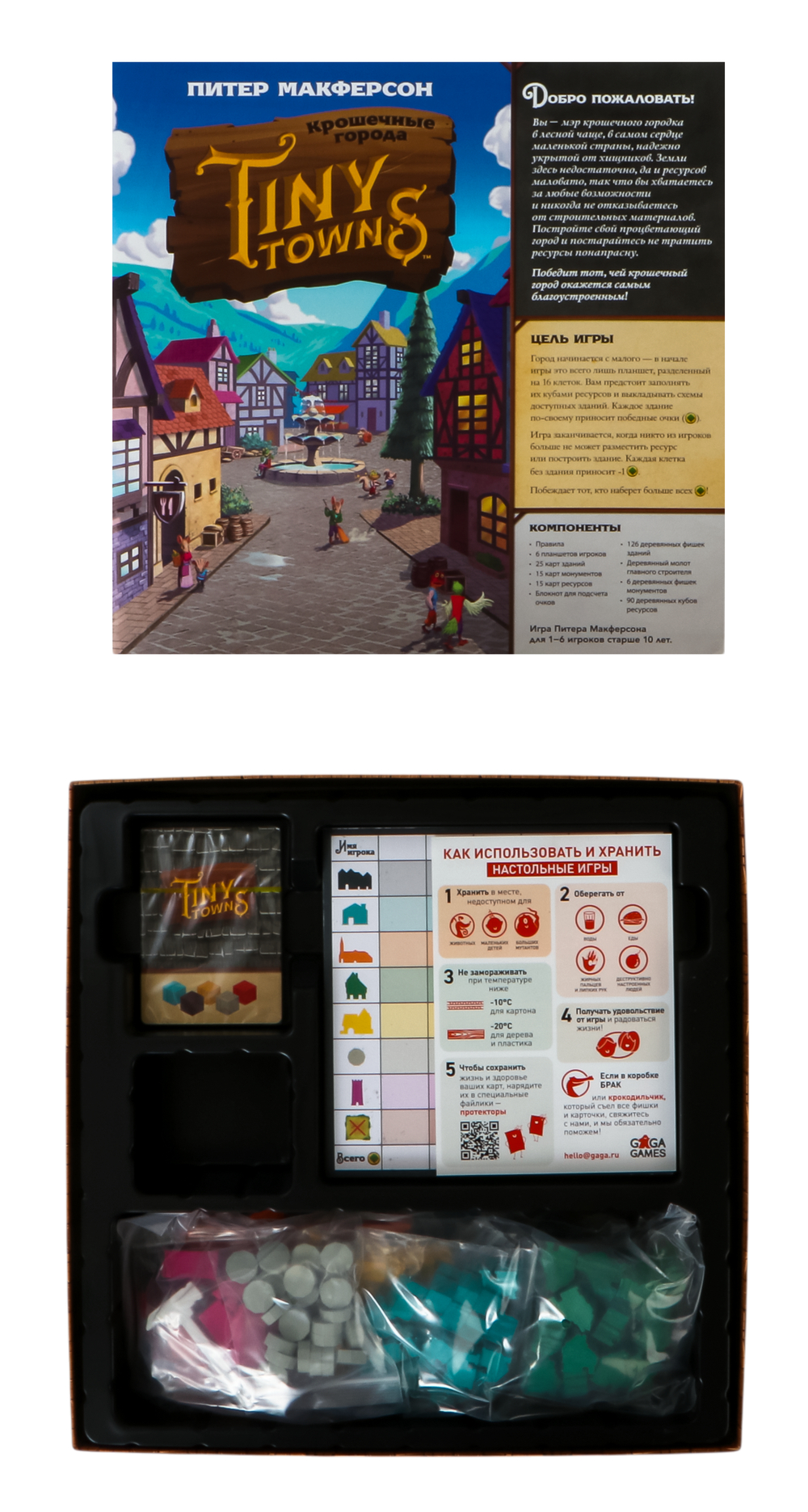 Несмотря на то, что в названии есть слово "крошечные", коробка довольно большая. Да и компонентов там достаточно: карты, планшеты, 90 деревянных кубиков ресурсов и 126 фигурок зданий.