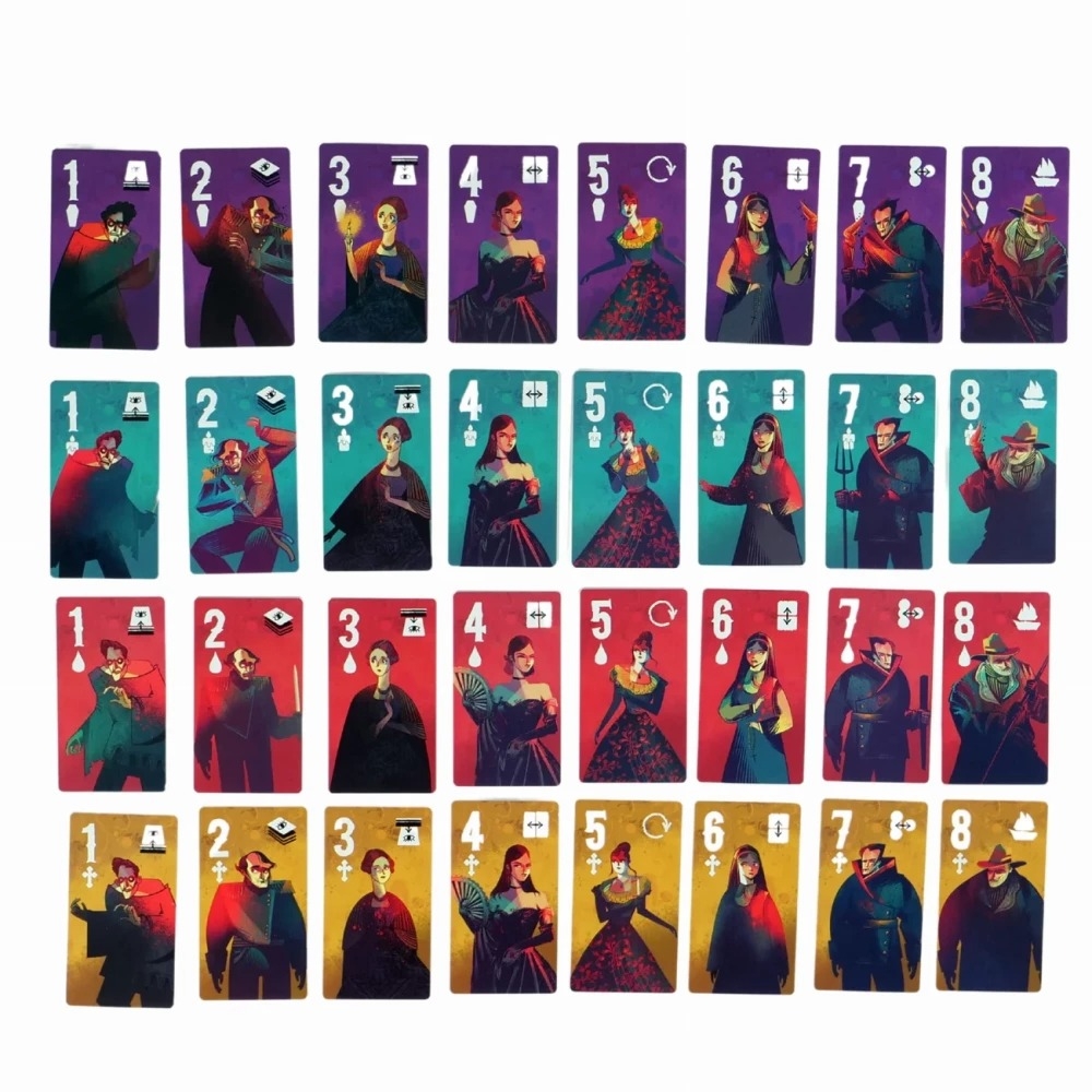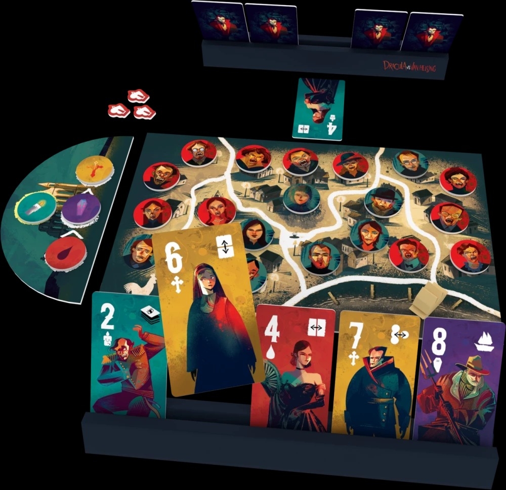 В этой дуэльной настольной игре один участник принимает сторону Ван Хельсинга, а другой – Дракулы. Действие происходит на игровом поле, поделённом на 5 кварталов, по 4 жителя в каждом. Игроки влияют на жителей с помощью карт 4 мастей достоинством от 1 до 8.