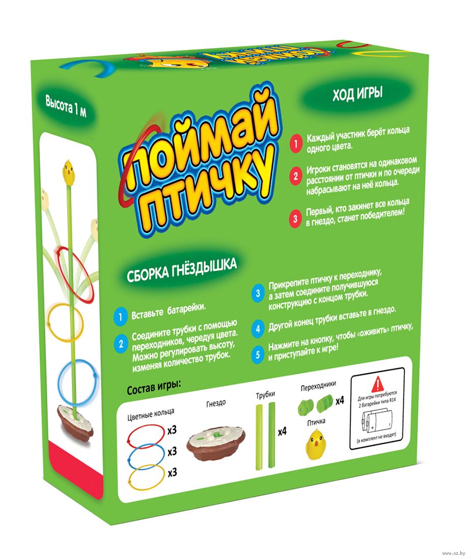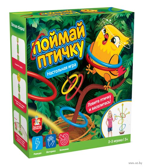 Настольная игра для детей "Поймай птичку" – это интересная игра на меткость и координацию движений. Играть могут до 3 игроков. Цель игры – закинуть все кольца в гнездо и поймать птичку!