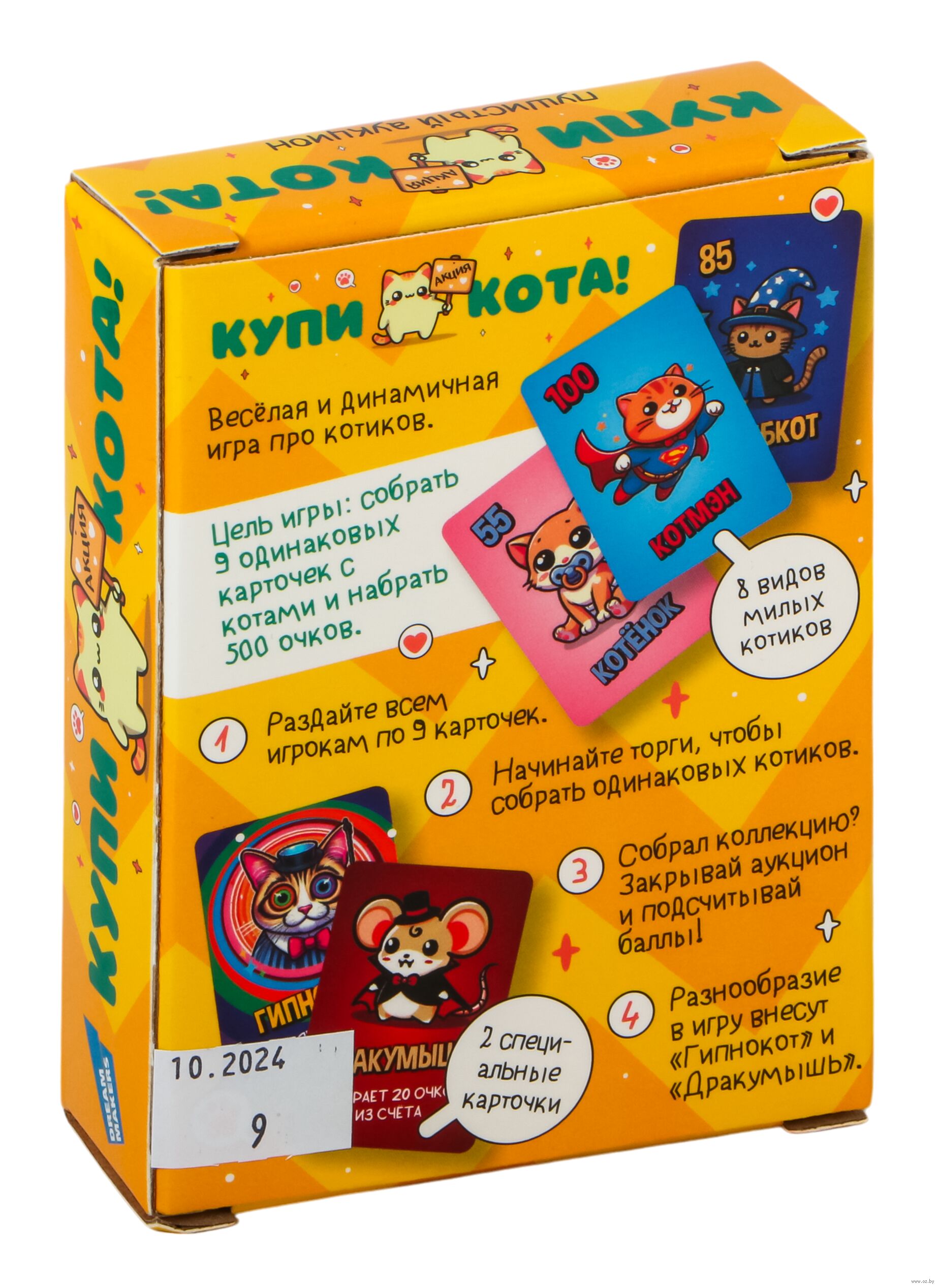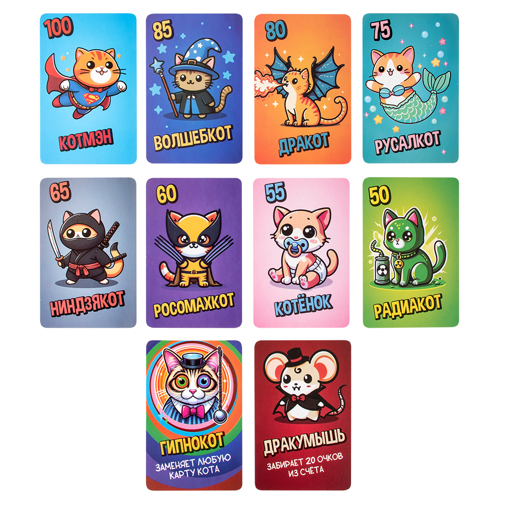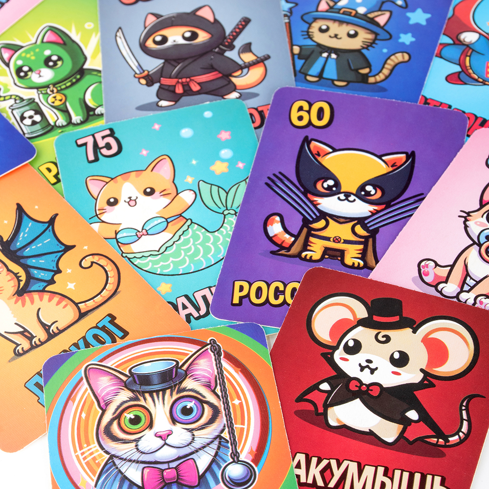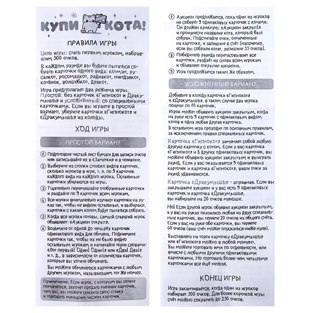 Правила игры просты. Каждый игрок получает по 9 карточек, и начинается увлекательный процесс торгов, цель которого – собрать 9 одинаковых котиков. Как только кому-то удастся собрать коллекцию, он закрывает торги и начинает подсчет баллов. Эта настольная игра развивает стратегическое мышление и способствует улучшению навыков общения.