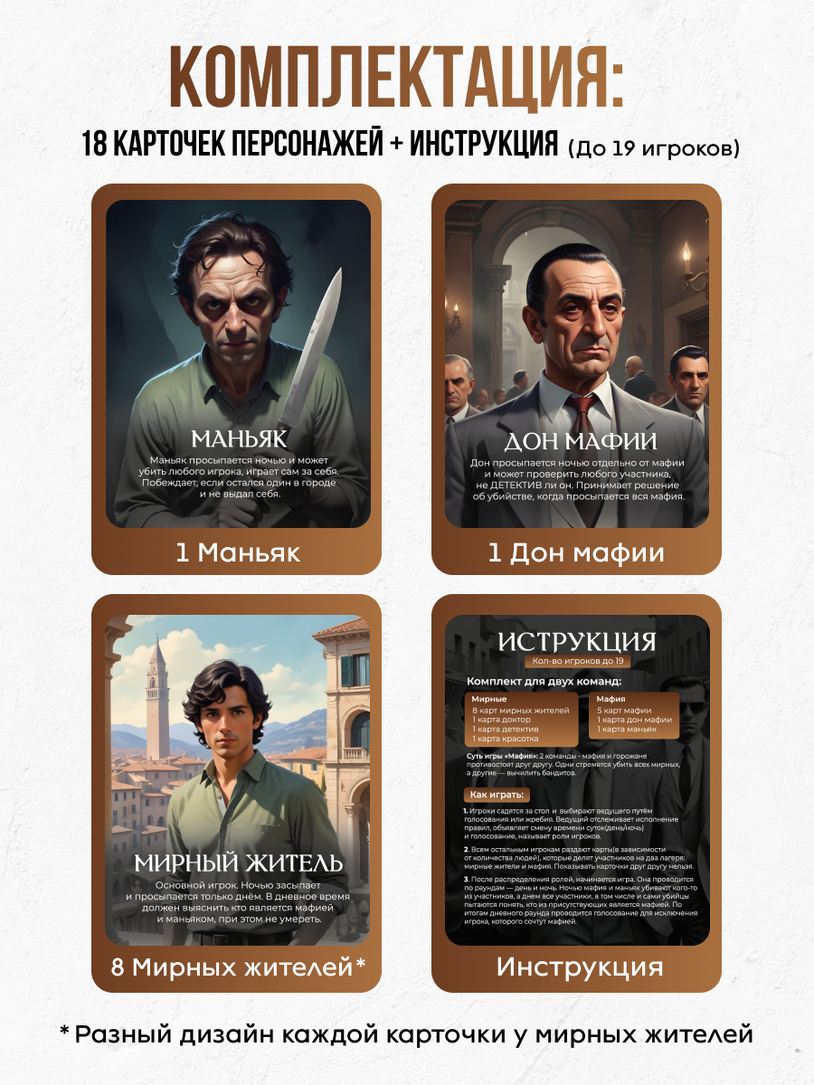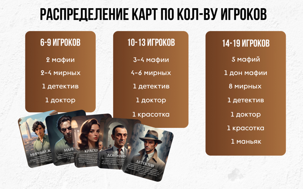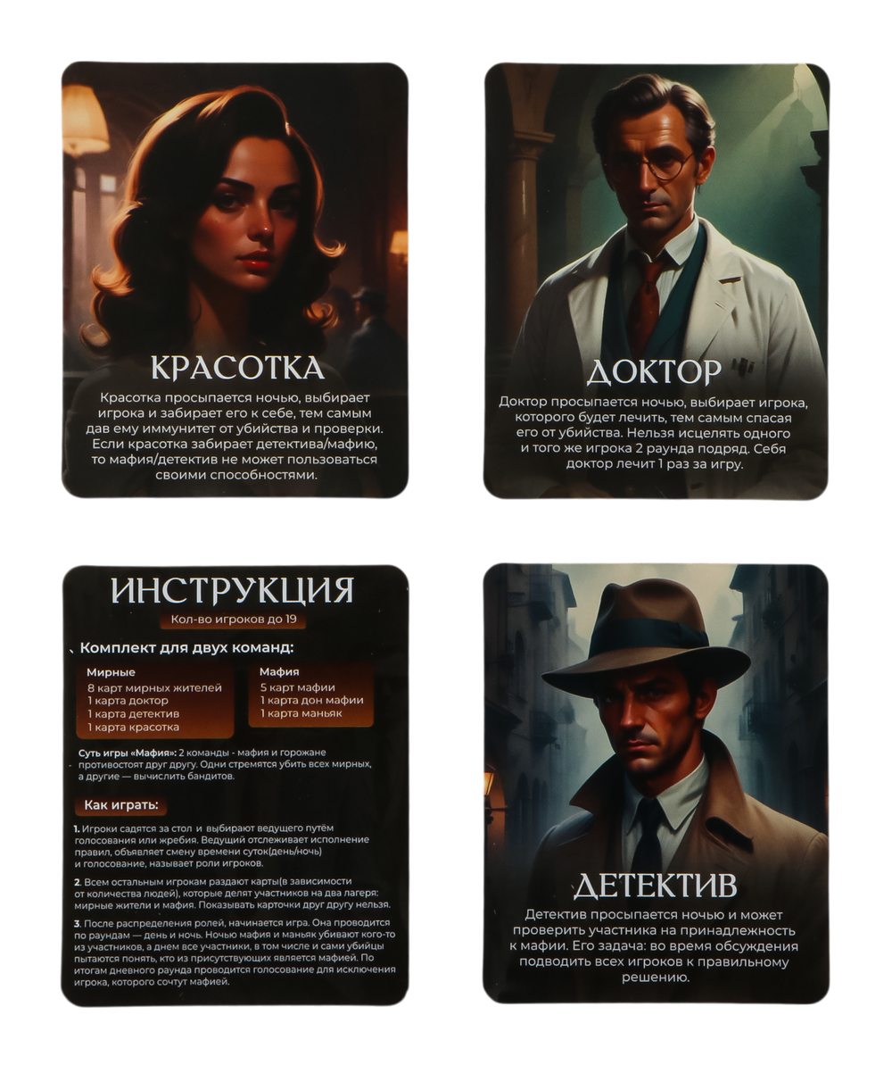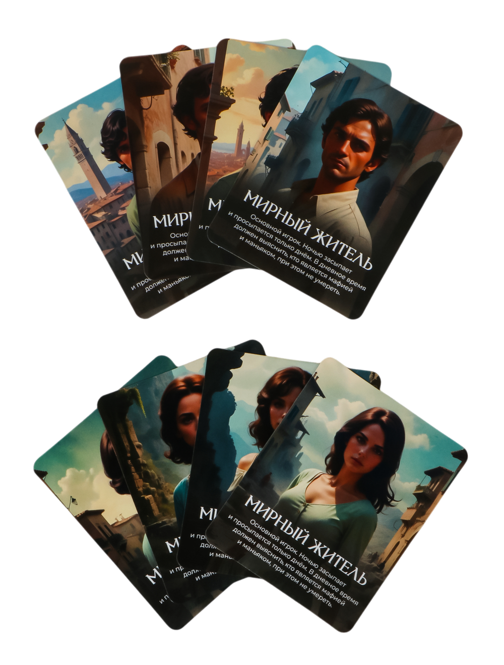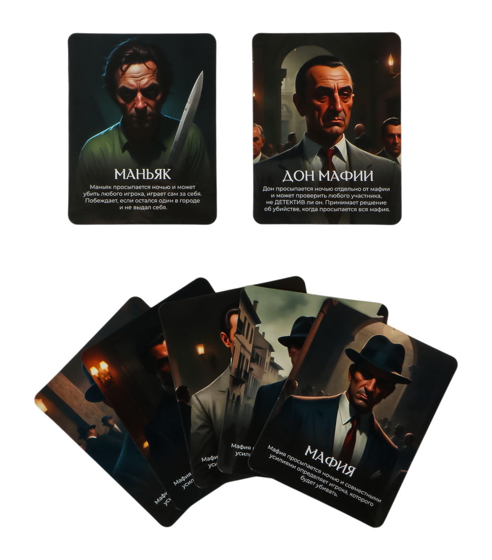 Мафия – игра, с которой вы погрузитесь в город, полный тайн, загадок и убийств. У всех жителей своя роль. Они делятся на 2 лагеря: мирные и мафия. Также в игре есть такие персонажи как маньяк, красотка, детектив, доктор. Ваша цель: выжить и выиграть, неважно, мафия вы или мирный житель.