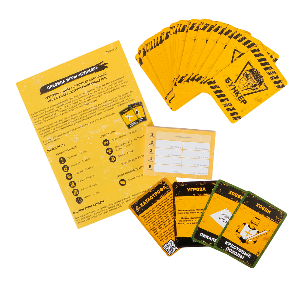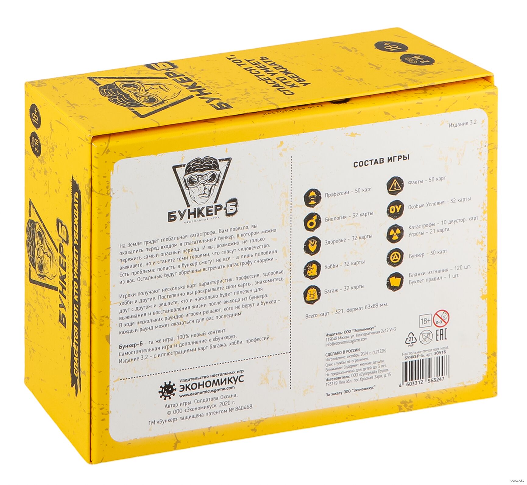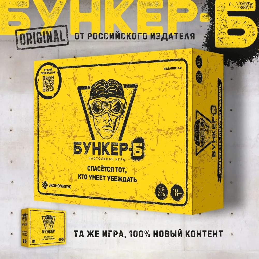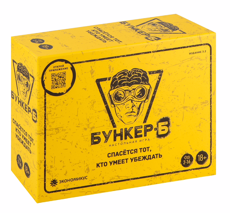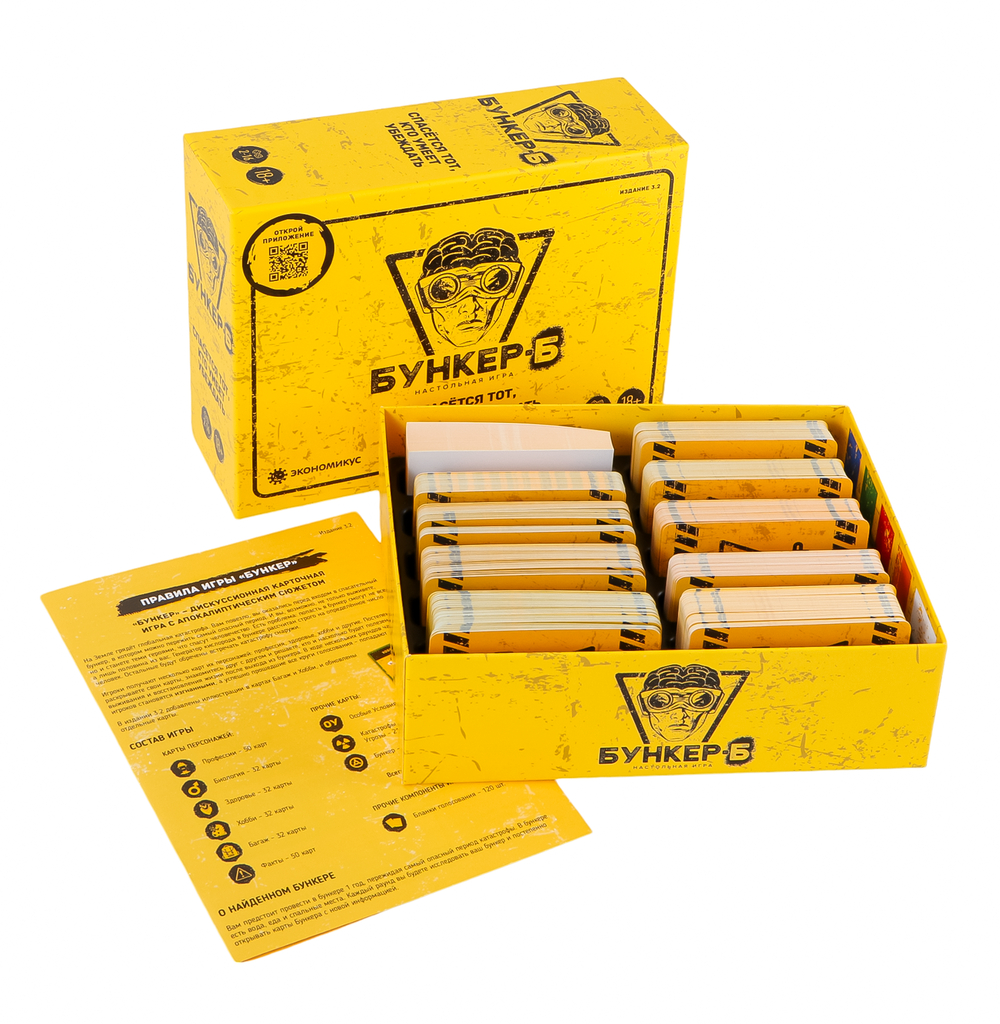 "Бункер-Б" – это сиквел культовой настолки "Бункер" от издательства "Экономикус". Основная механика осталась прежней, но все карты полностью обновлены. В наборе – новые непредсказуемые ситуации, 20 новых катастроф, профессий, необычных персонажей и фактов. Вновь каждый участник становится кем-то другим – от клоуна до киберспортсмена, и на этот раз выбор становится еще более захватывающим. Как и раньше, задача игроков – убедить команду в своей необходимости, ведь только так можно попасть в бункер и выжить.