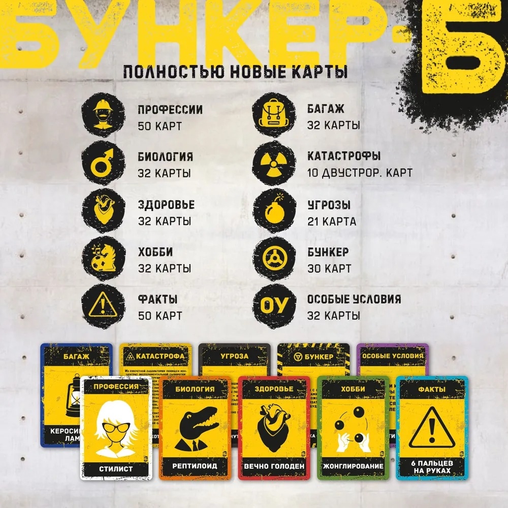 Игра "Бункер-Б" – та же культовая игра, 100% новый контент! Играй как в самостоятельную игру или смешай Бункер-Б и Бункер (любую редакцию), чтобы получить в 2 раза больше разных карт.