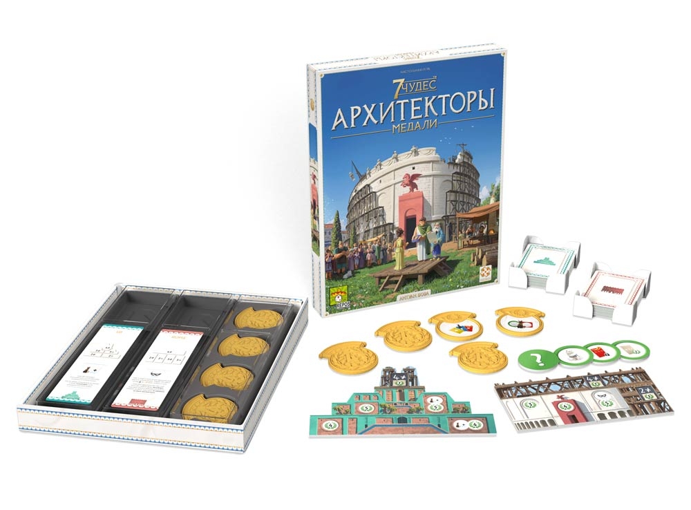 В этом дополнении появляются два новых Чуда света, новые жетоны Развития и совершенно новые элементы – Медали. Дополнение 7 Чудес Архитекторы. Медали добавляет новые стратегии в базовую игру, однако условия победы остаются прежними.