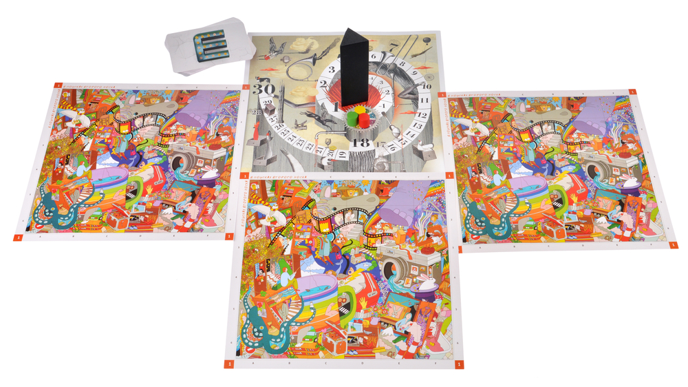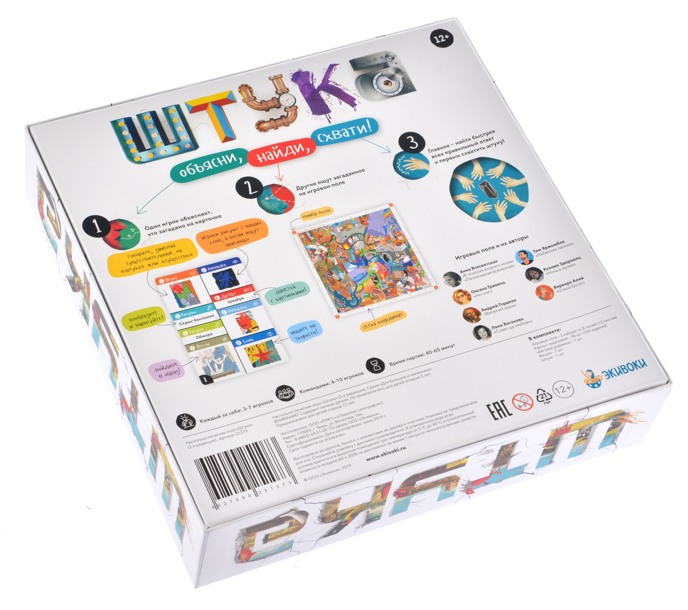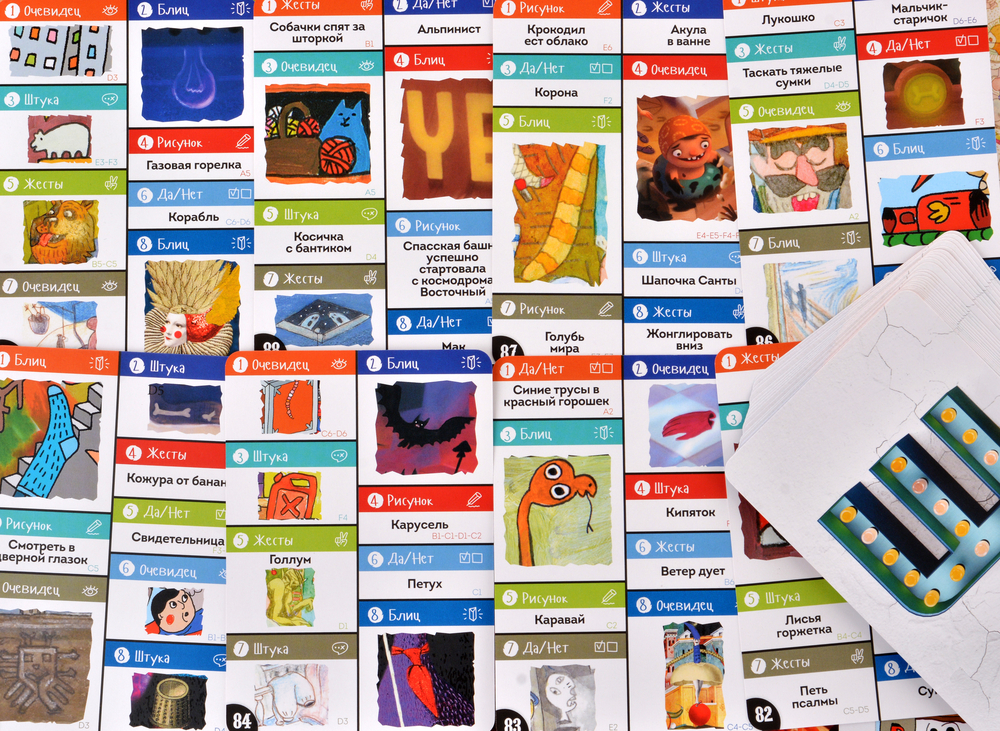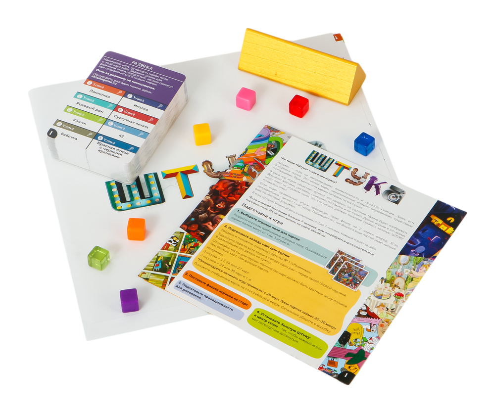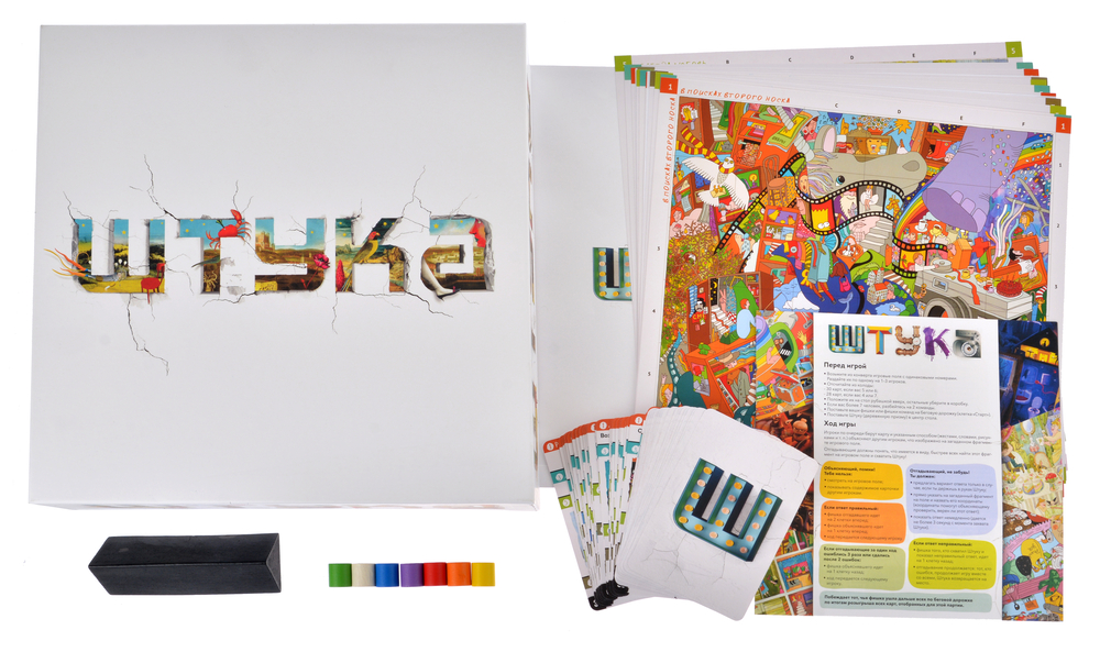 "Штука" – это веселая и необычная смесь импровизационных игр и «книжек-пряталок». Здесь нужно объяснять жестами, рисунками и словами кусочки картин, наполненных разнообразными сюжетами и деталями. Тот, кто отгадал, должен скорее найти ответ на поле и первым схватить Золотую Штуку! Если ответ правильный, фишка отгадавшего идет вперед, если нет – назад.