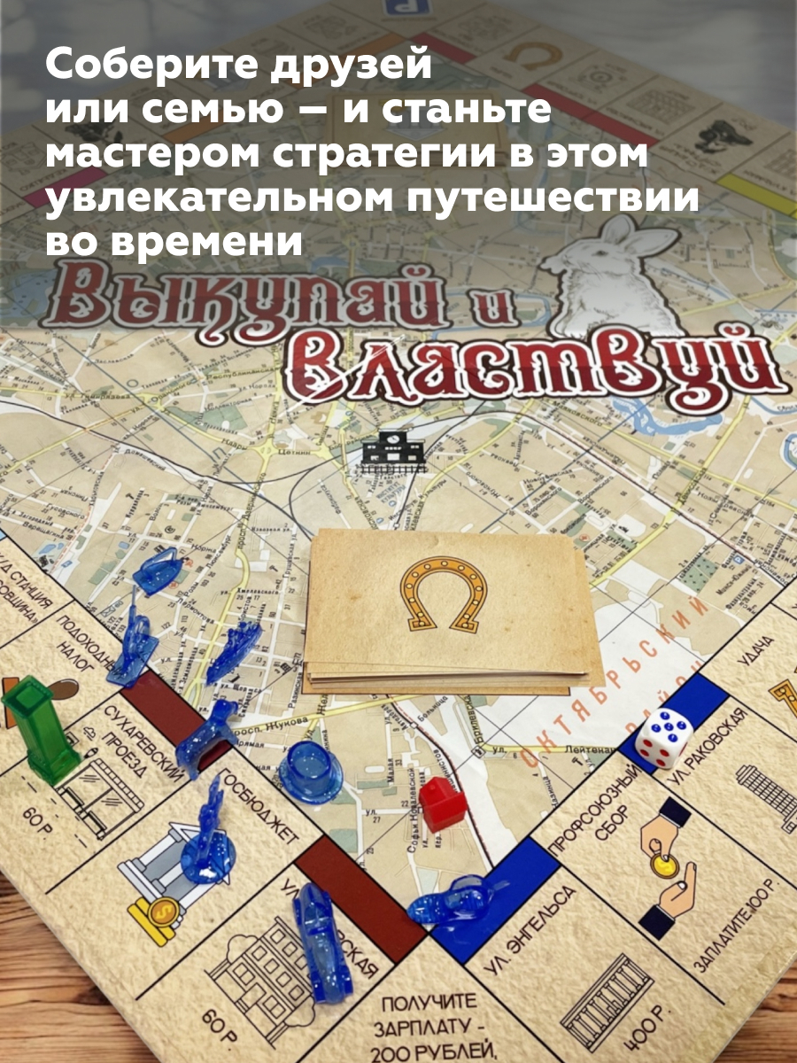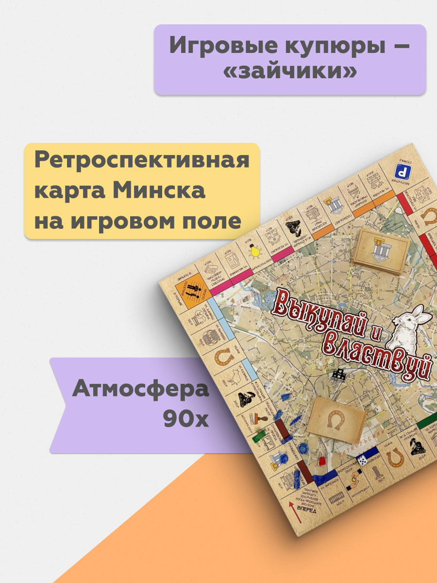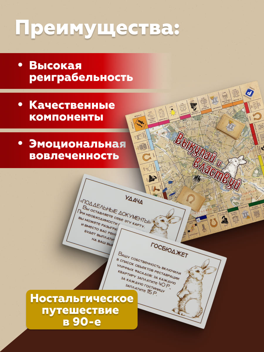 Забавная интерпретация знаменитой монополии) Только с отсылкой на 90-е хи-хи Купюры с зайчиками, рысями и бобрами заставляют умиляться, а деньги за свадебный сервис тааак приятно было получать))) Хоть в этой игре я могу построить квартиру на любой улице))) Сама игра яркая и красочная! Коробочка плотная, игровое поле, которое долго прослужит, удобная подложка для раскладки купюр и карт собственности, прикольные фишки игроков) Короче, игра 100 из 10!