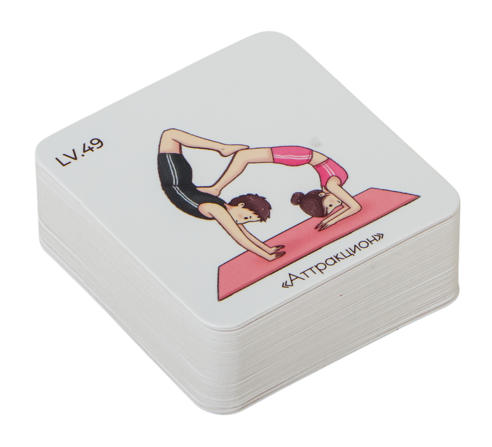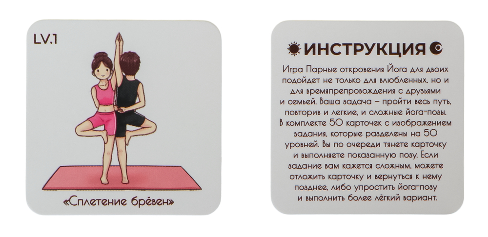 Эта игра включает 50 карточек с разнообразными позами йоги для двоих, которые вы сможете повторить вместе с партнером.