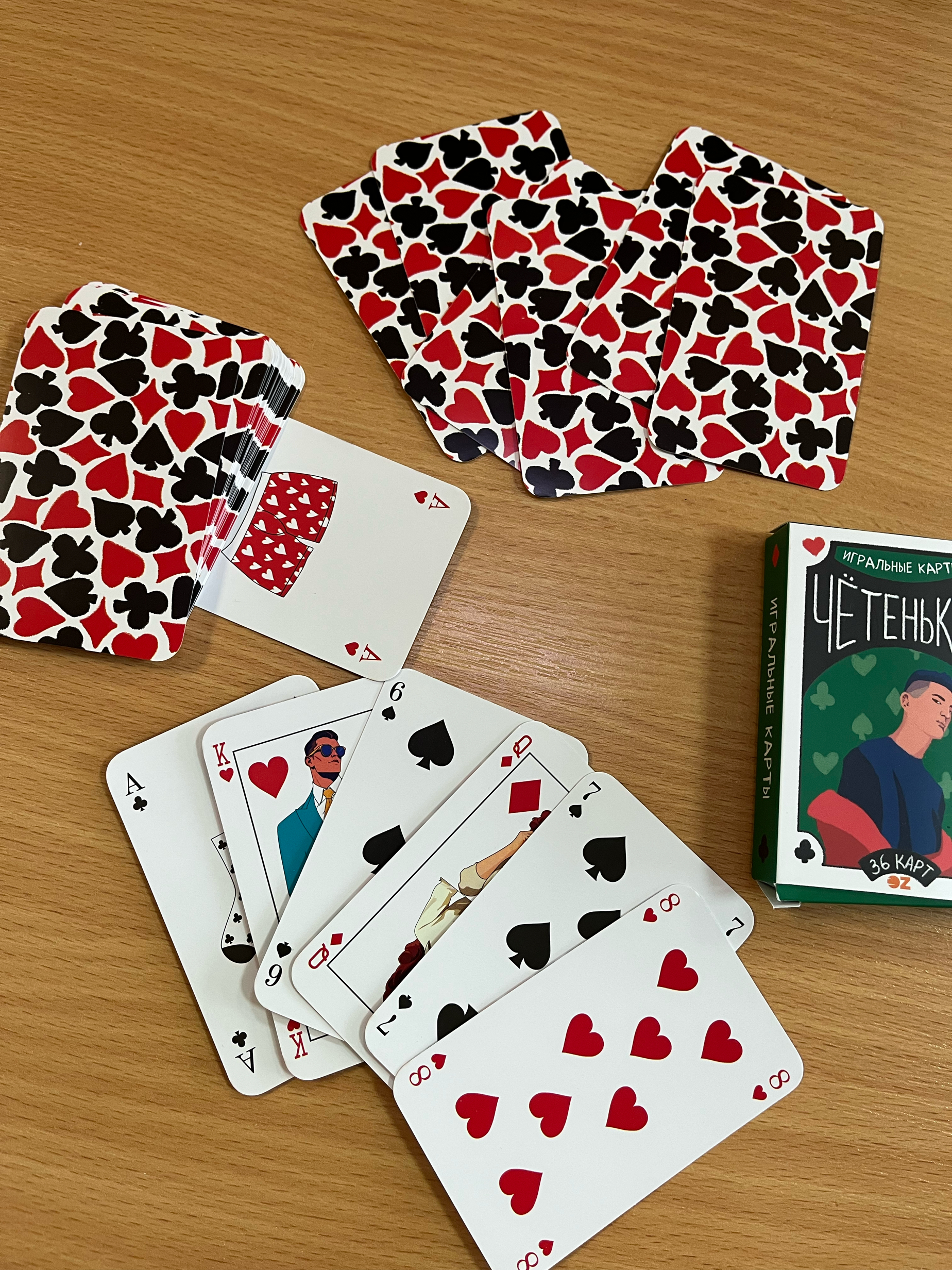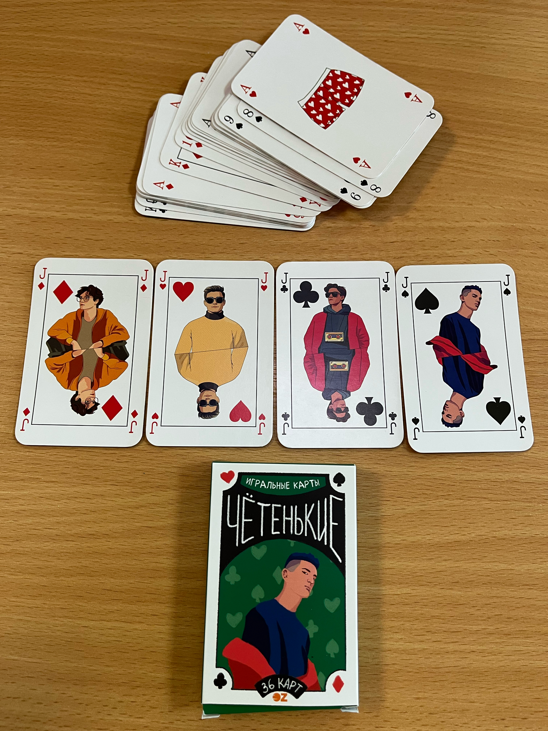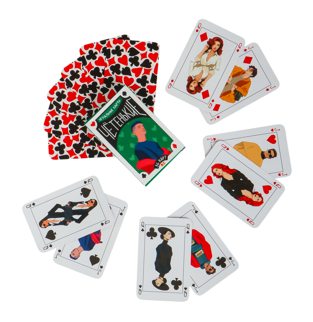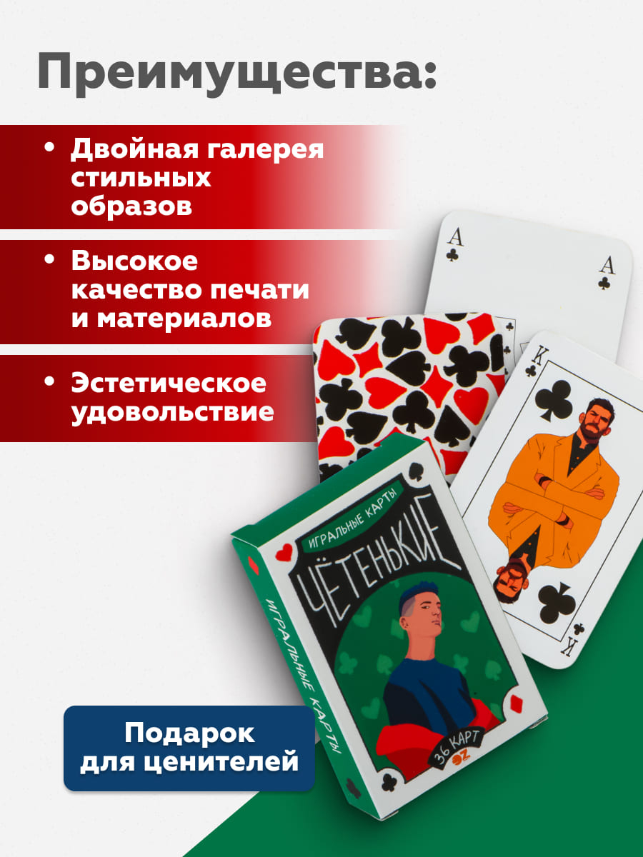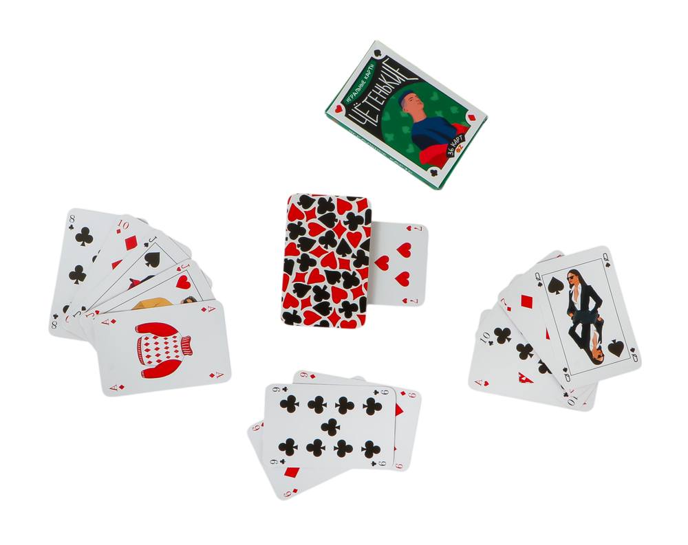 Погрузитесь в мир элегантной эстетики и современного стиля с игральной колодой "Чётенькие"! Её эксклюзивный дизайн покорит сердца любителей карточных игр и моды.