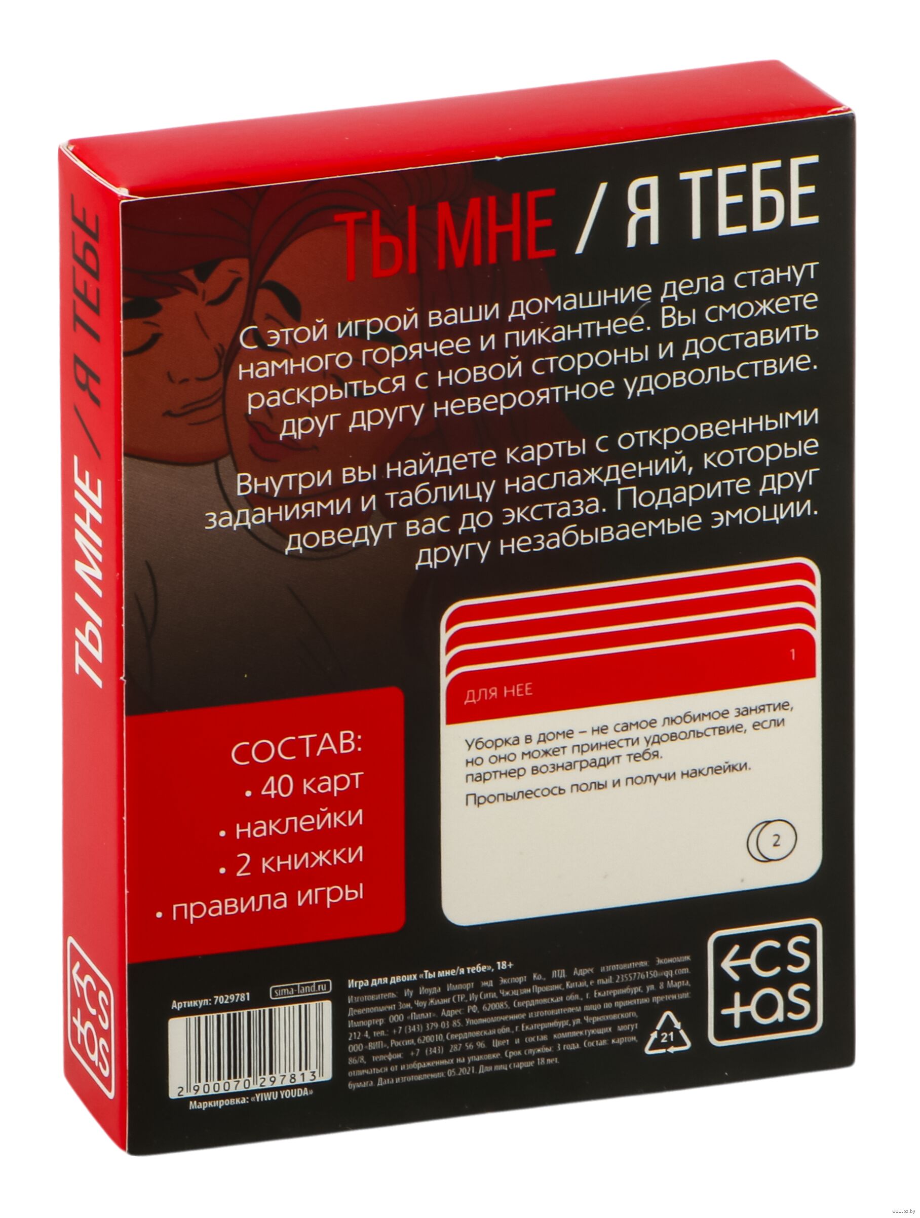 С этой игрой ваши домашние дела станут намного горячее и пикантнее. Вы сможете раскрыться с новой стороны и доставить друг другу невероятное удовольствие. Внутри найдёте карты с откровенными заданиями и таблицу наслаждений, которые доведут вас до экстаза.