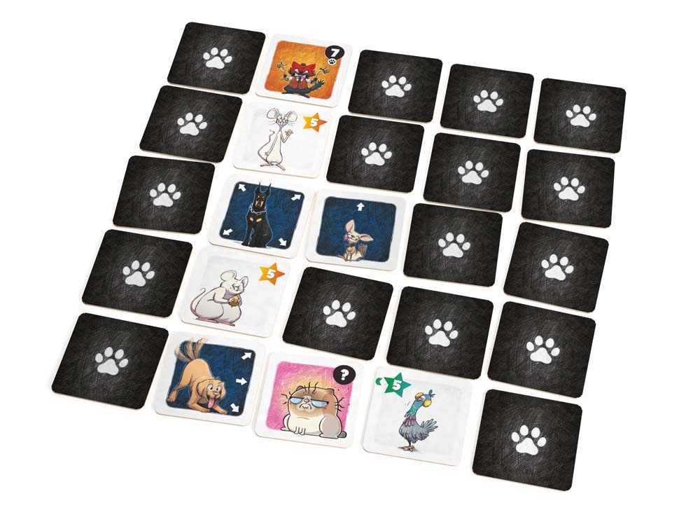По очереди открывайте и меняйте местами тайлы. Выгодно расставьте своих котов на поле и постарайтесь поймать как можно больше добычи, чтобы победить. Но берегитесь собак!
