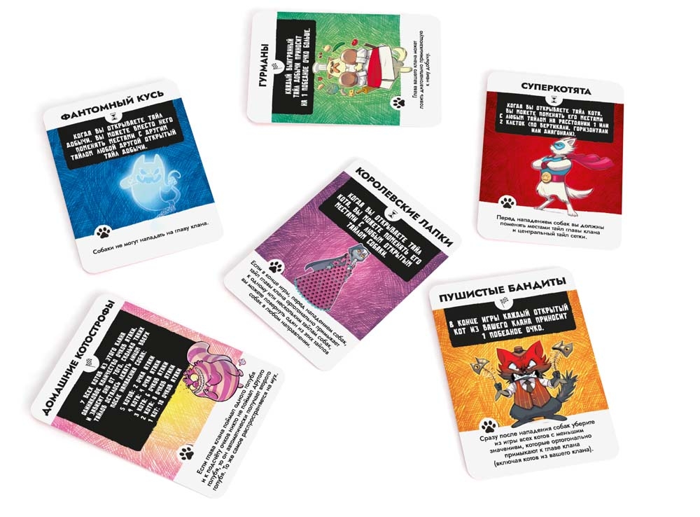 35 тайлов котов (по 5 тайлов для каждого из 7 кланов, включая бонусный клан)