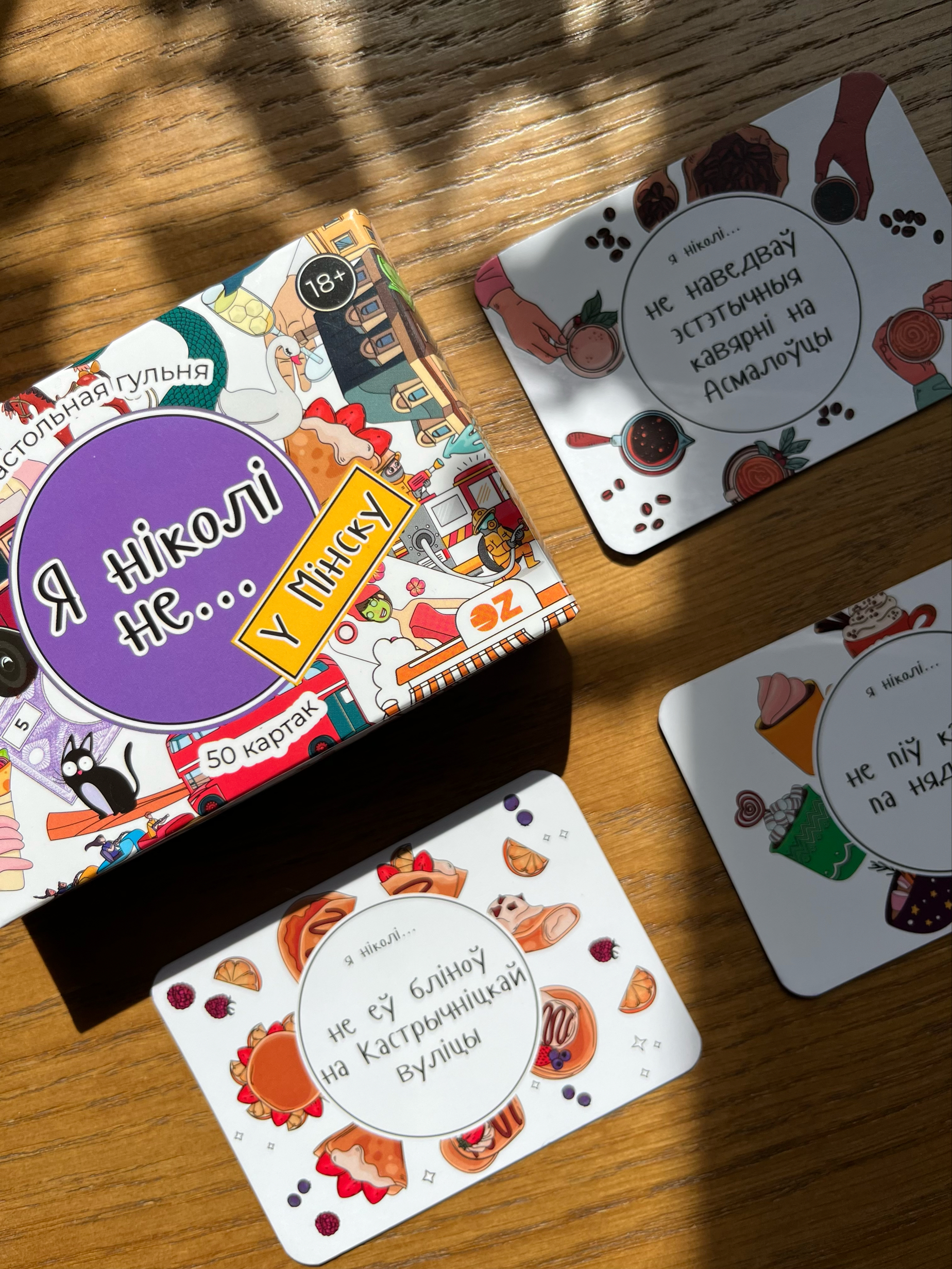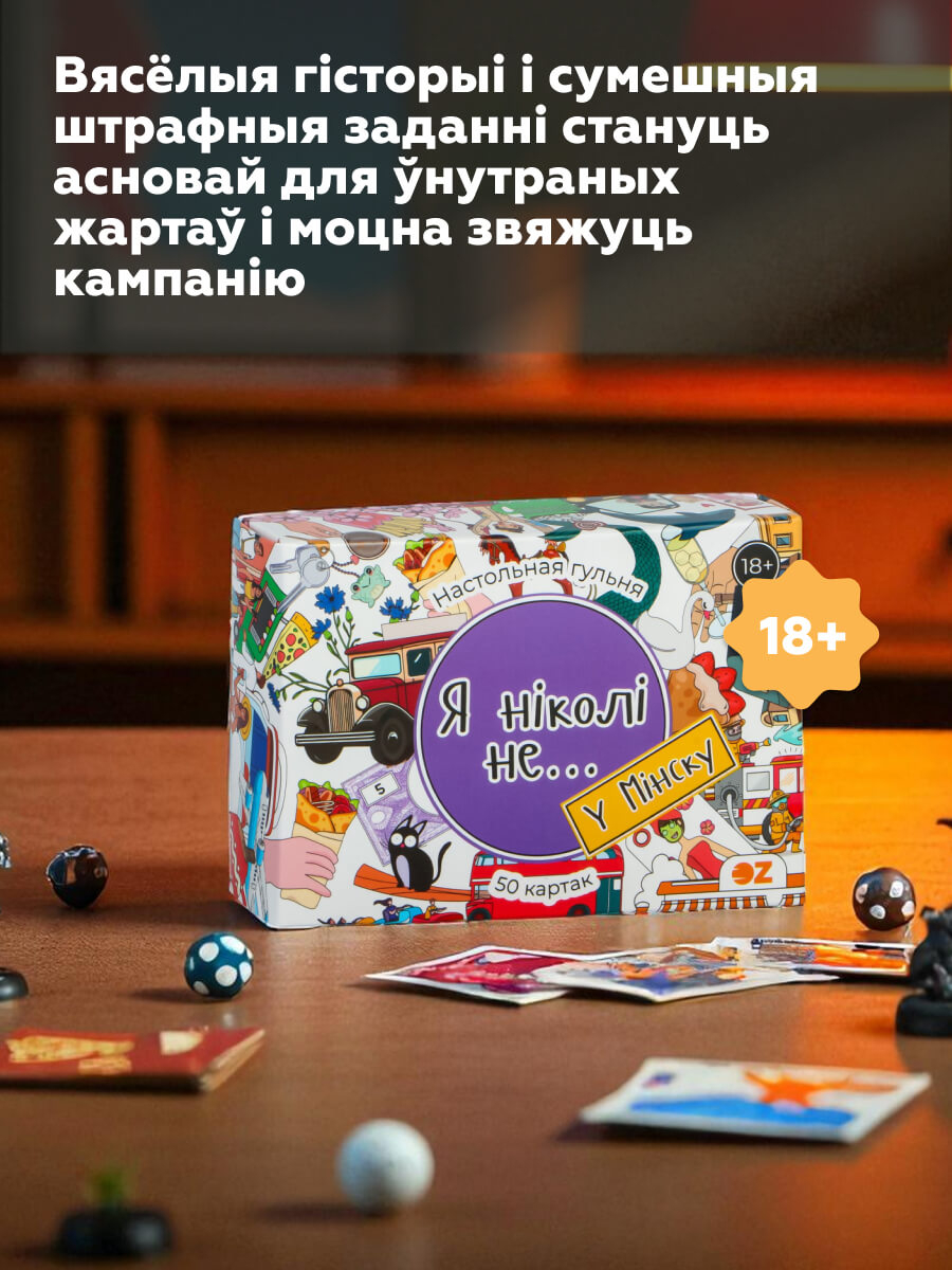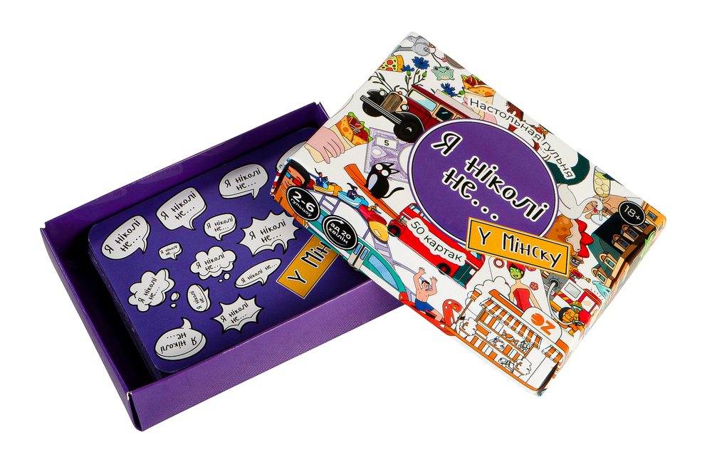 Даследвайце лакацыі сталіцы Беларусі – ад велічнага опернага тэатра да ўтульных вулачак "вулачак центра". Правілы простыя і нязменныя: калоду кладуць у цэнтр, кожны гулец па чарзе цягне карту і чытае фразу. Калі нехта з прысутных хоць раз у жыцці рабіў тое, аб чым напісана, ён павінен расказаць гісторыю, як гэта адбывалася. А таксама выканаць штраф, які вы ўсёй кампаніяй прыдумаеце напачатку гульні. Гэта можа быць спартыўнае (10 прысяданняў), гастранамічнае (з'есці што-небудзь незвычайнае) ці бытавое заданне (пачысціць бульбу).