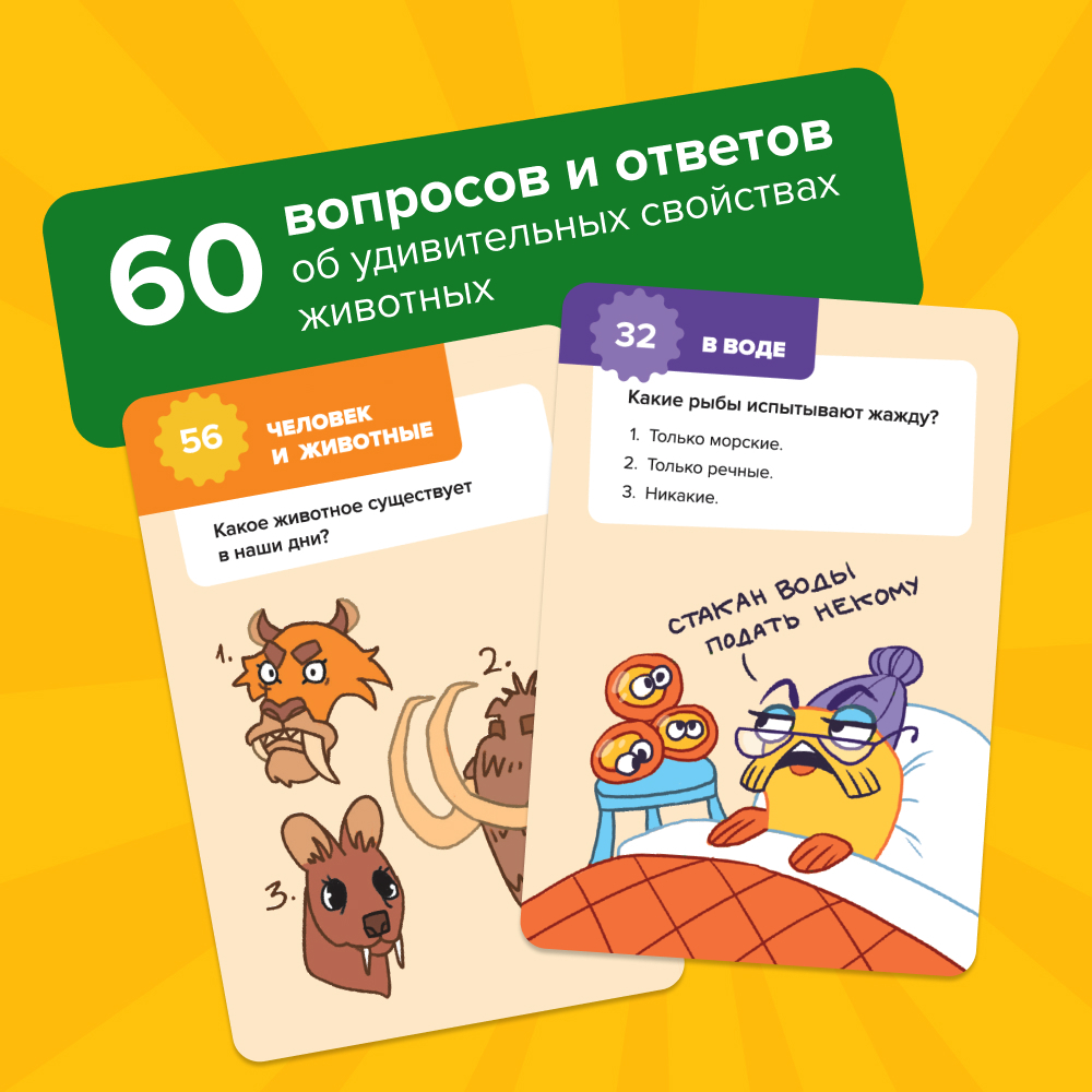 60 вопросов, на которые предстоит ответить игрокам, познакомят с понятиями "мимикрия", "эволюция", "симбиоз", помогут в изучении школьного курса. Карточки разделены на категории, охватывающие всё животное царство: "В воде", "Человек и животные", "Кто это?", "На земле", "В воздухе". Казалось бы, на карточке даны и варианты ответов, но как выбрать единственный верный, если все они правдоподобны? Тем важнее и интереснее будет объяснение, данное в книжке-энциклопедии для каждого вопроса.