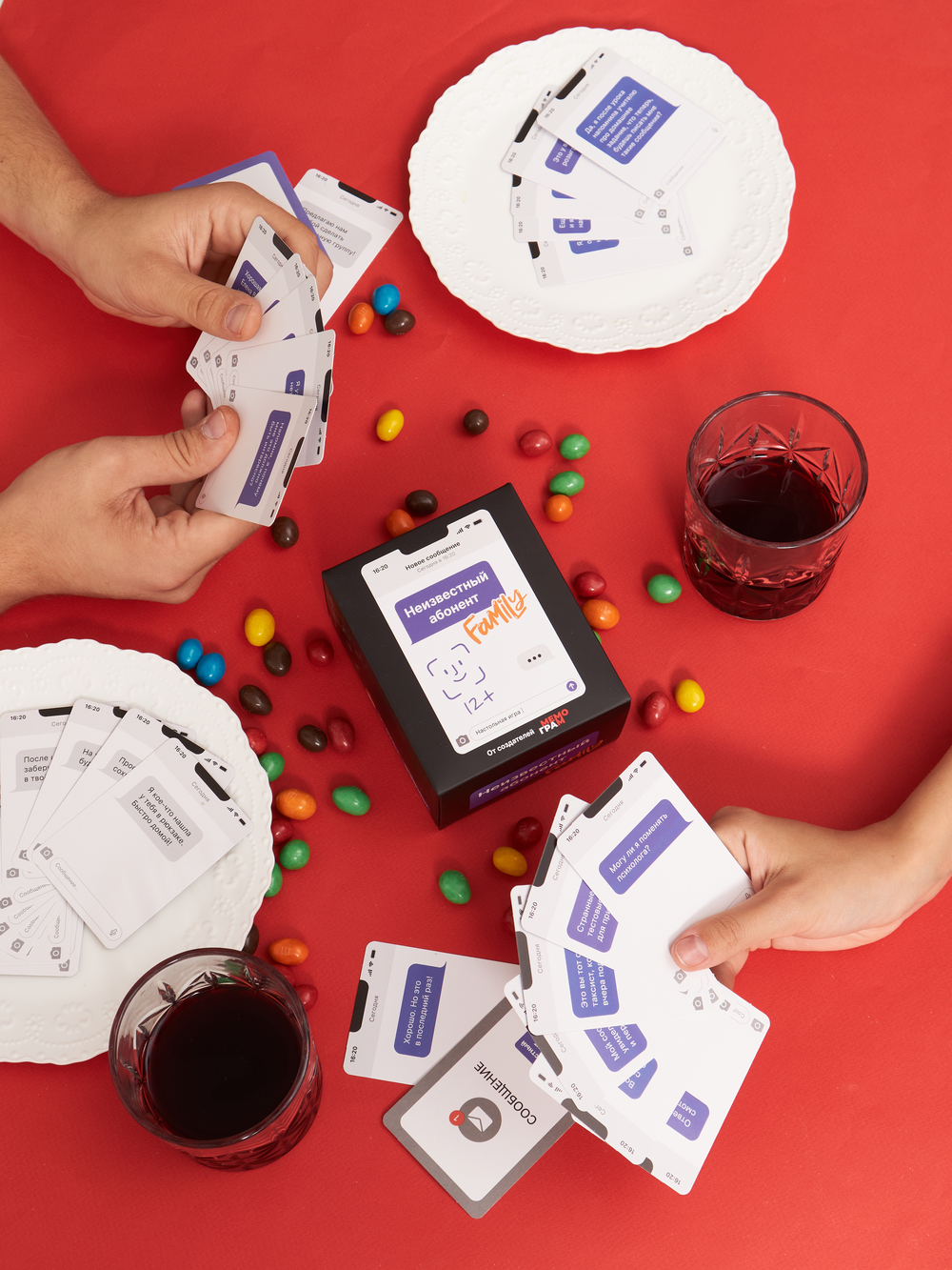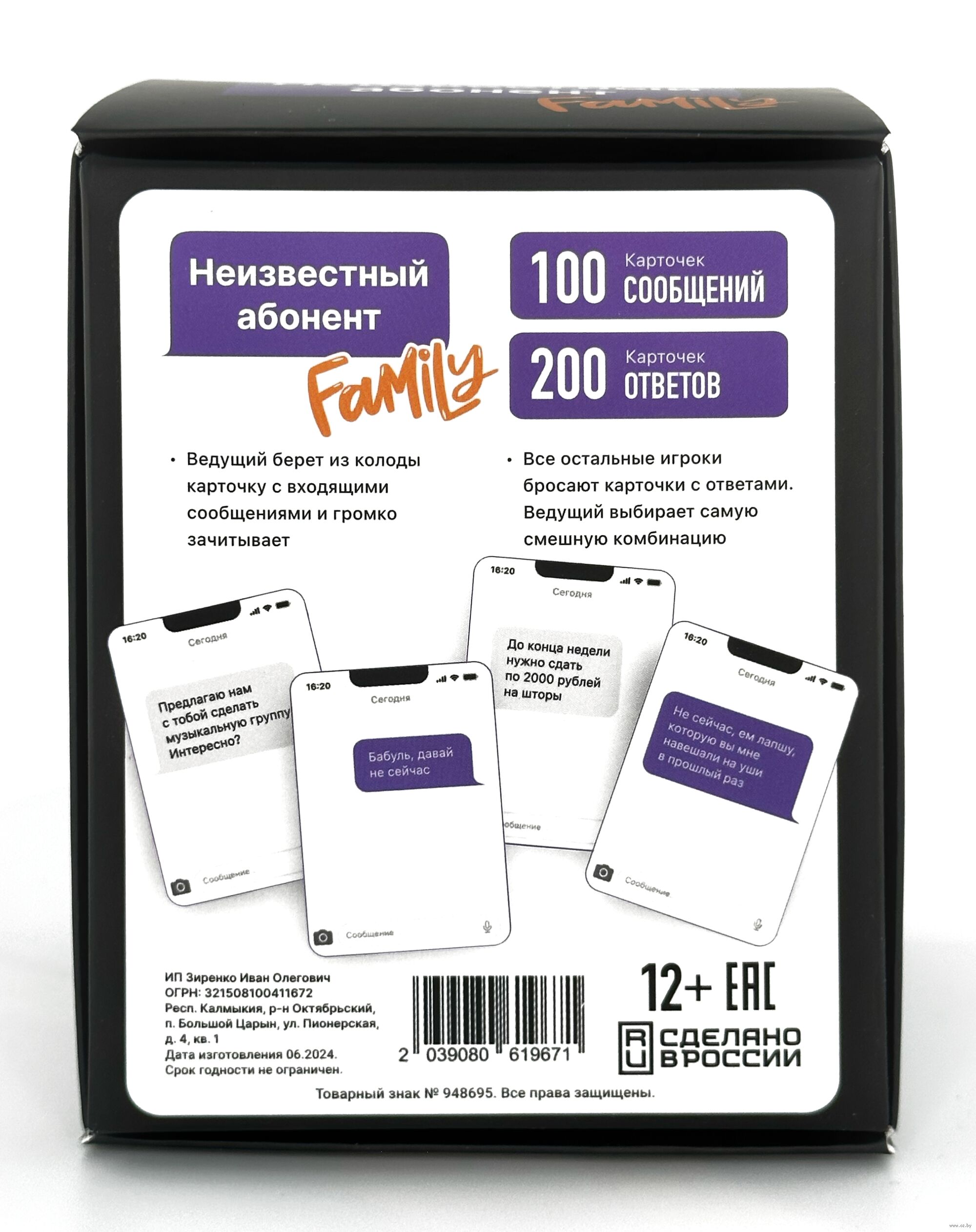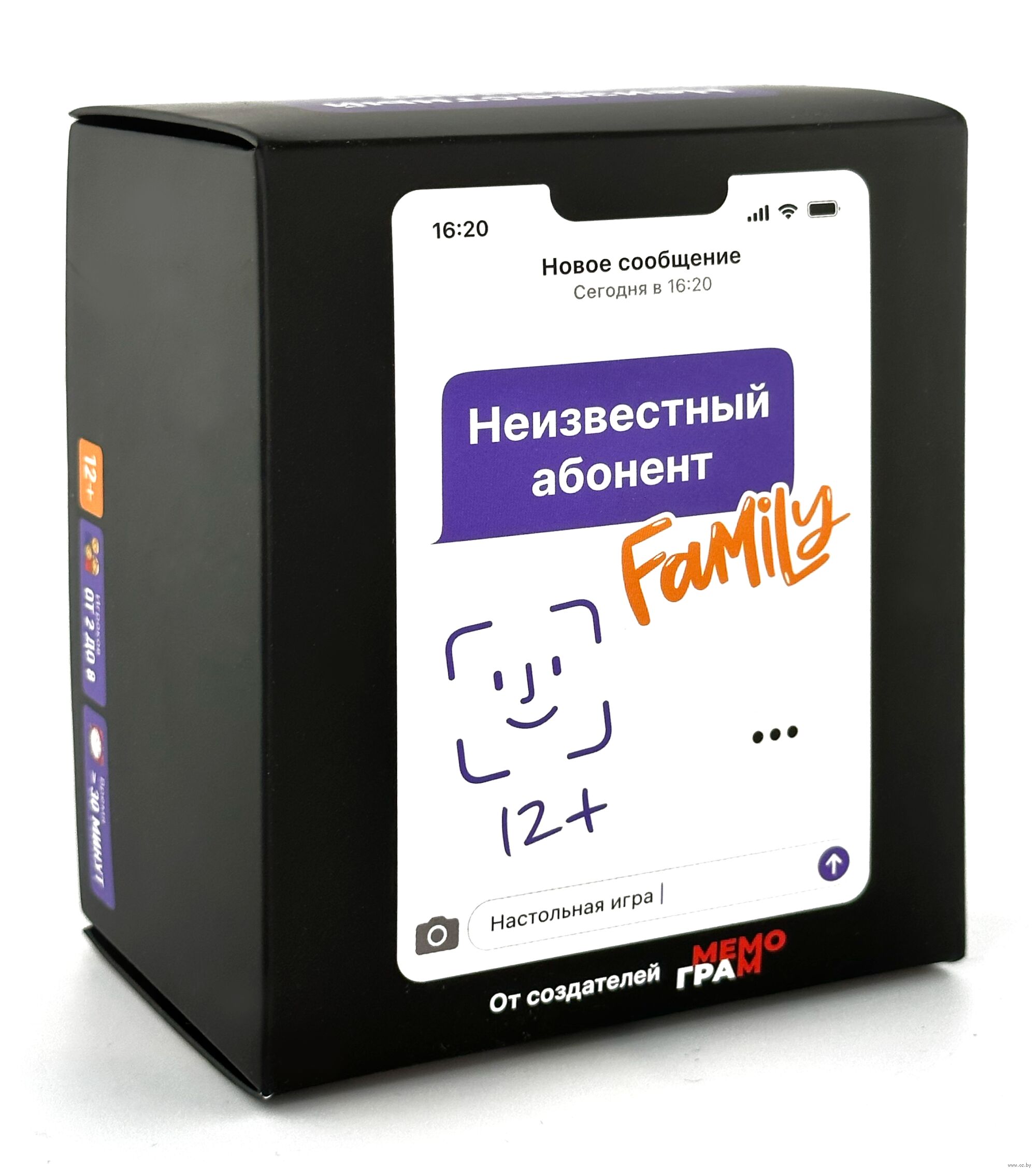 Семейная серия нашумевшей настольной игры для любой компании "Неизвестный абонент. Family" – это игра для детей и компании с текстовыми сообщениями, где игроки соревнуются в создании самых смешных комбинаций входящих и исходящих СМС-ок. Соберите все версии игры и веселитесь по полной!