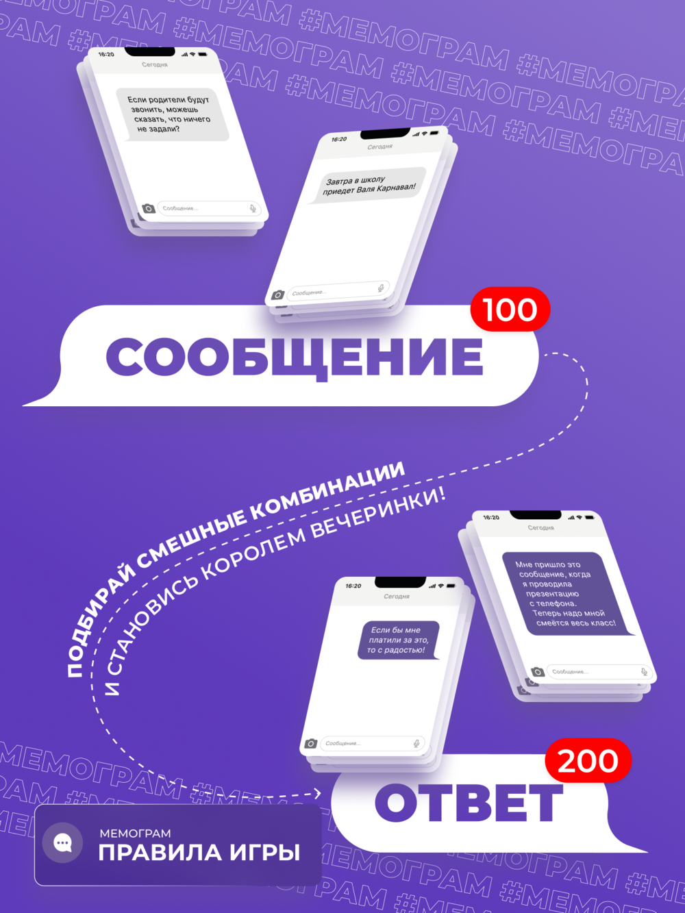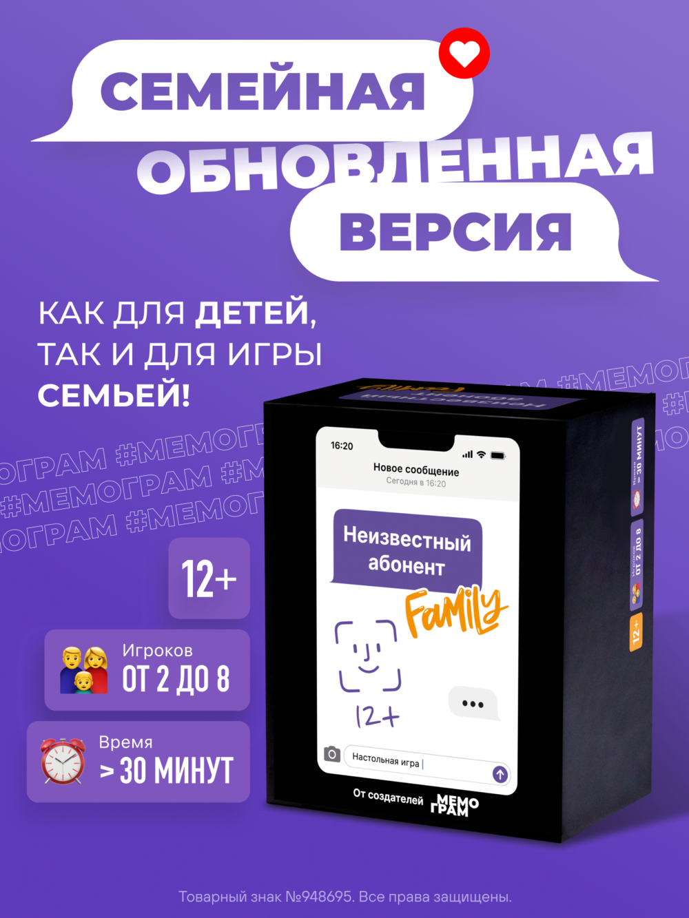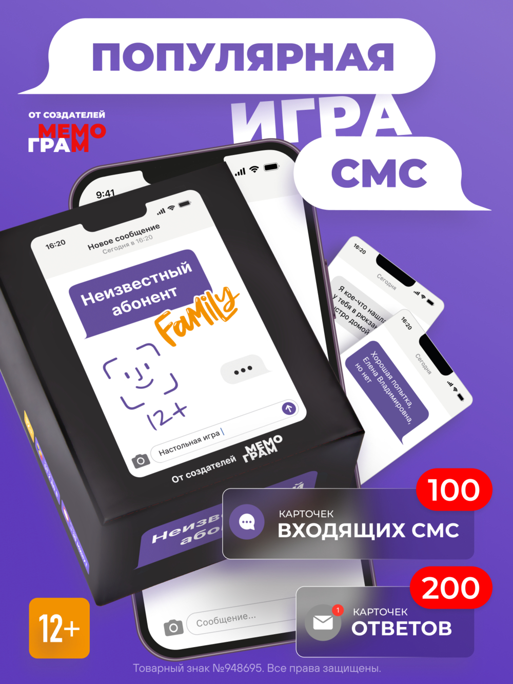 Семейная серия нашумевшей настольной игры для любой компании "Неизвестный абонент. Family" – это игра для детей и компании с текстовыми сообщениями, где игроки соревнуются в создании самых смешных комбинаций входящих и исходящих СМС-ок. Соберите все версии игры и веселитесь по полной!