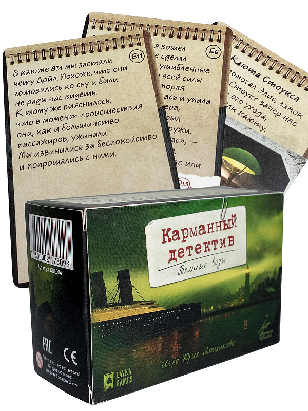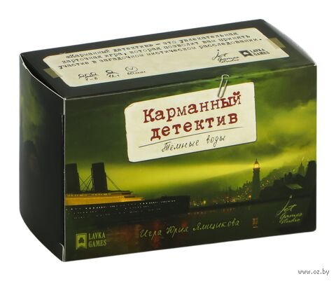 "Карманный детектив. Тёмные воды" – это компактное мистическое приключение. В этой игре нет поля, нет правил и все, что нужно сделать, это открыть коробку и все, игра началась. Главным вашим ресурсом здесь является время, которое влияет на исход расследования. В этой игре вам предстоит распутать клубок загадочных и таинственных событий, произошедших на океанском лайнере. Собирайте улики, опрашивайте подозреваемых, опираясь на логику и дедукцию, и помните: время в этом расследовании не на вашей стороне.